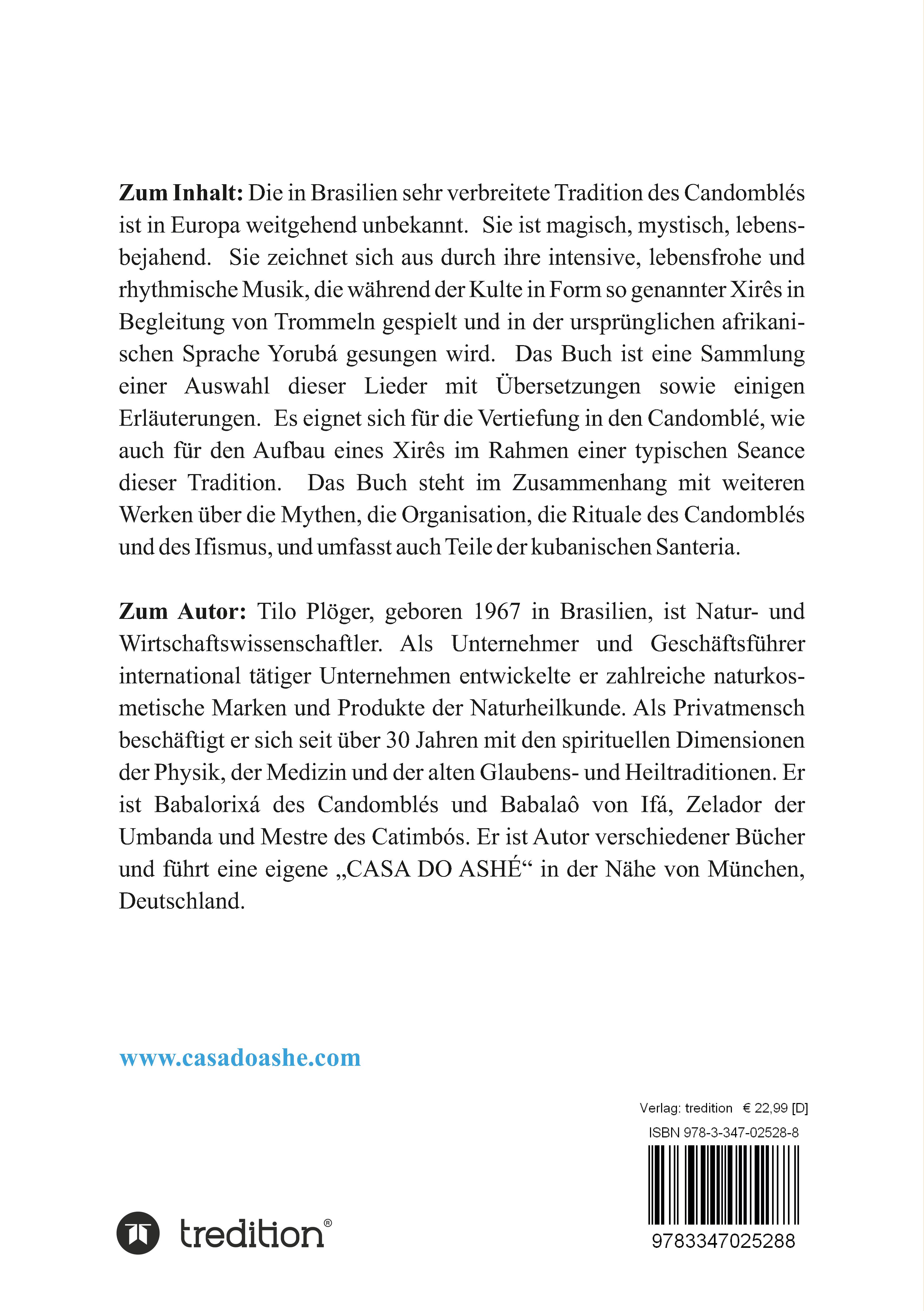 Die in Brasilien sehr verbreitete Tradition des Candomblés ist in Europa weitgehend unbekannt. Sie ist magisch, mystisch, lebensbejahend. Sie zeichnet sich aus durch ihre intensive, lebensfrohe und rhythmische Musik, die während der Kulte in Form so genannter Xirês in Begleitung von Trommeln gespielt und in der ursprünglichen afrikanischen Sprache Yorubá gesungen wird. Das Buch ist eine Sammlung einer Auswahl dieser Lieder mit Übersetzungen sowie einigen Erläuterungen. Es eignet sich für die Vertiefung in den Candomblé, wie auch für den Aufbau eines Xirês im Rahmen einer typischen Seance dieser Tradition. Das Buch steht im Zusammenhang mit weiteren Werken über die Mythen, die Organisation, die Rituale des Candomblés und des Ifismus, und umfasst auch Teile der kubanischen Santeria.
