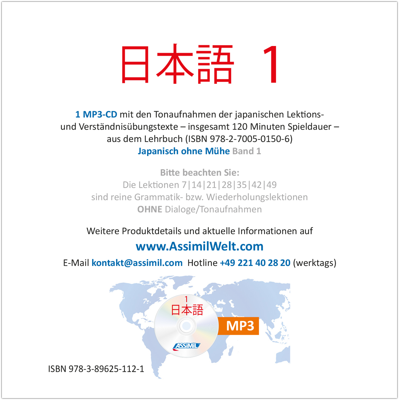 Die MP3-CD (120 Minuten Spieldauer) enthält die japanischen Tonaufnahmen (Lektionstexte und Verständnisübungen) passend zum Lehrbuch "Japanisch ohne Mühe Band 1". Die Aufnahmen wurden ausschließlich mit Muttersprachlern (allesamt professionelle Sprecherinnen und Sprecher) produziert. Die Sprechgeschwindigkeit ist dem jeweiligen Lektionsniveau angepasst. Die MP3-CD bietet zusätzlich eine Textanzeigefunktion bei geeignetem Abspielgerät.