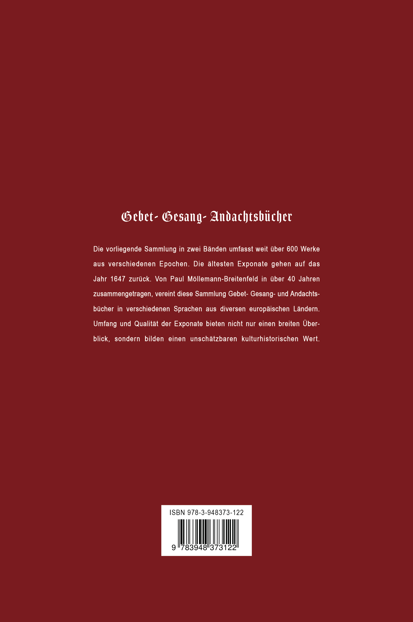 Die vorliegende Sammlung in zwei Bänden umfasst weit über 600 Werke aus verschiedenen Epochen. Die ältesten Exponate gehen auf das Jahr 1647 zurück. Von Paul Möllemann-Breitenfeld in über 40 Jahren zusammengetragen, vereint diese Sammlung Gebet- Gesang- und Andachtsbücher in verschiedenen Sprachen aus diversen europäischen Ländern. Umfang und Qualität der Exponate bieten nicht nur einen breiten Überblick, sondern bilden einen unschätzbaren kulturhistorischen Wert.