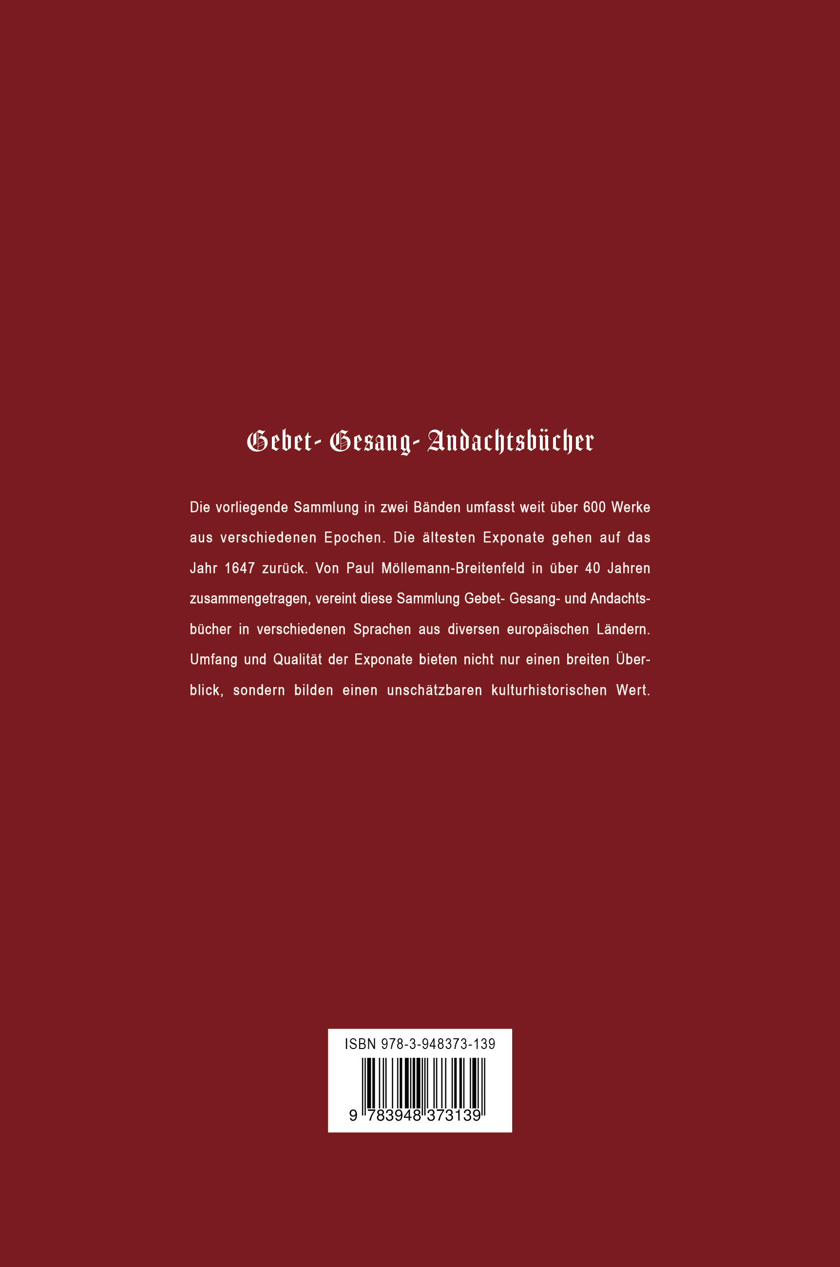 Die vorliegende Sammlung in zwei Bänden umfasst weit über 600 Werke aus verschiedenen Epochen. Die ältesten Exponate gehen auf das Jahr 1647 zurück. Von Paul Möllemann-Breitenfeld in über 40 Jahren zusammengetragen, vereint diese Sammlung Gebet- Gesang- und Andachtsbücher in verschiedenen Sprachen aus diversen europäischen Ländern. Umfang und Qualität der Exponate bieten nicht nur einen breiten Überblick, sondern bilden einen unschätzbaren kulturhistorischen Wert.