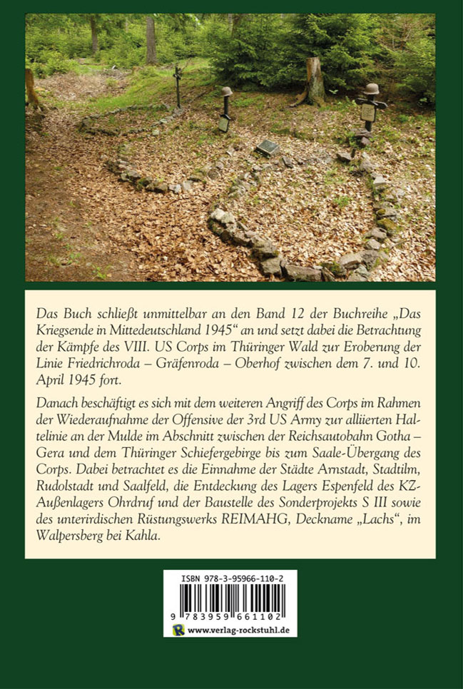 Autor: Jürgen Möller, Festeinband, 308 Seiten, 210 Fotos und Abbildungen sowie 2 Karten im Vor- und NachsatzBuchreihe: Kriegsende in Mitteldeutschland 1945 | Bd.14. ÜBER DAS BUCH:Am 6. April 1945 hat die Offensive der 3rd US Army unter dem Kommando von General Pat-ton die Haltelinie der 12th Army Group Mühlhausen - Langensalza - Gotha - Oberhof - Suhl erreicht. Damit beginnen die Vorbereitungen für den letzten Stoß zur alliierten Haltelinie an der Elbe und Mulde. Doch erst einmal gilt es, den letzten deutschen Widerstand eingekreister deutscher Verbände im Thüringer Wald zu beseitigen.Hier schließt das Buch unmittelbar an den Band 12 der Buchreihe "Das Kriegsende in Mitte-deutschland 1945" an und setzt dabei die Betrachtung der Kämpfe des VIII. US Corps im Thü-ringer Wald bis zur Eroberung der Linie Friedrichroda - Gräfenroda - Oberhof zwischen dem 7. und 10. April 1945 fort. Danach beschäftigt es sich mit dem weiteren Angriff des Corps im Rahmen der Wiederauf-nahme der Offensive der 3rd US Army zur alliierten Haltelinie an der Mulde im Abschnitt zwi-schen der Reichsautobahn Gotha - Gera und dem Thüringer Schiefergebirge bis zum Saale-Übergang des Corps. Dabei betrachtet es die Einnahme der Städte Arnstadt, Stadtilm, Ru-dolstadt und Saalfeld, die Entdeckung des Lagers Espenfeld des KZ-Außenlagers Ohrdruf und der Baustelle des Sonderprojekts S III sowie des unterirdischen Rüstungswerks REIMAHG, Deckname "Lachs", im Walpersberg bei Kahla.Damit setzt der nunmehr 14. Band der Dokumentationsreihe "Das Kriegsende in Mittel-deutschland 1945" die Darstellung der Besetzung Mitteldeutschlands fort und bildet den Aus-gangspunkt für vier weitere Bände, die sich mit der Einnahme der Thüringer Waffenschmiede und den Kämpfen im Thüringisch-fränkischen Schiefergebirge, Vogtland und Westerzgebirge beschäftigen.