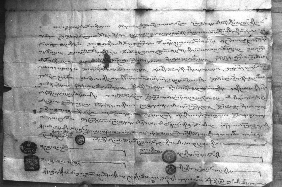 Date: 1935–1936 An order from a ruler of Baragaon to the lama of Künzang Chöling to act like his illustrious predecessors. The document forbids the lama from maltreating the nuns by tying up and whipping them, and also from depriving them of food, on pain of paying a fine of 1000 rupees.
