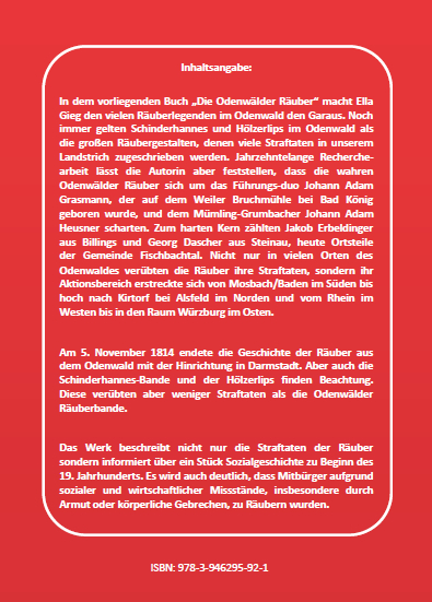 In dem vorliegenden Buch „Die Odenwälder Räuber“ macht Ella Gieg den vielen Räuberlegenden im Odenwald den Garaus. Noch immer gelten Schinderhannes und Hölzerlips im Odenwald als die großen Räubergestalten, denen viele Straftaten in unserem Landstrich zugeschrieben werden. Jahrzehntelange Recherche-arbeit lässt die Autorin aber feststellen, dass die wahren
