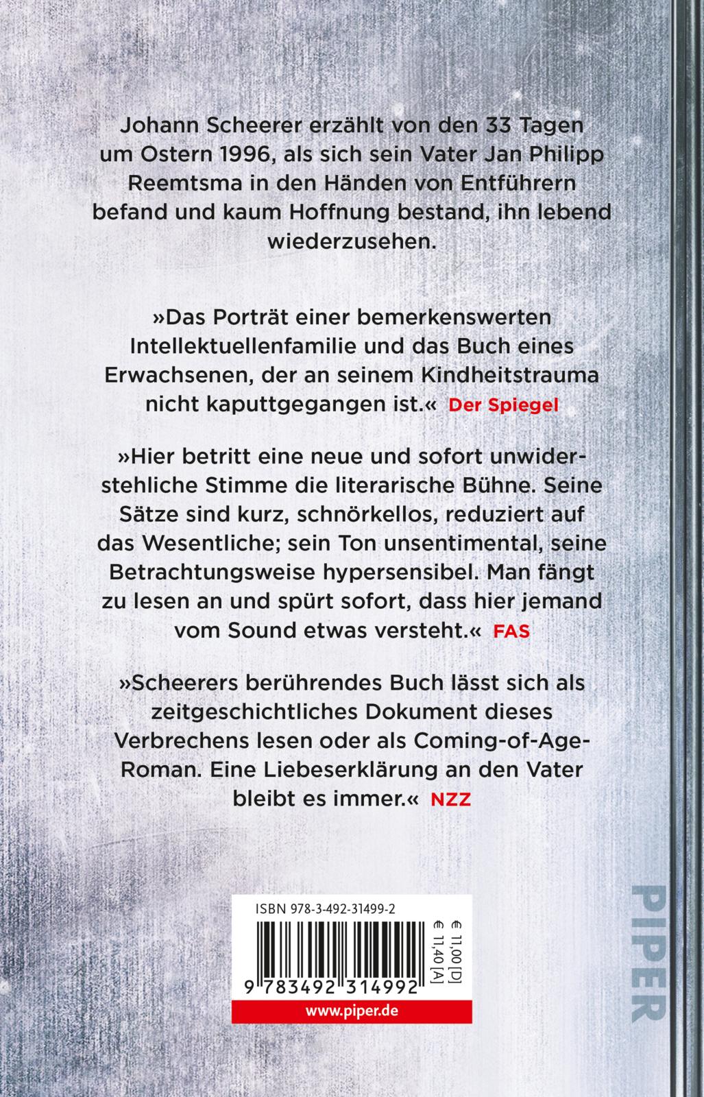 Johann Scheerer erzählt auf berührende und mitreißende Weise von den 33 Tagen um Ostern 1996, als sich sein Vater Jan Philipp Reemtsma in den Händen von Entführern befand, das Zuhause zu einer polizeilichen Einsatzzentrale wurde und kaum Hoffnung bestand, ihn lebend wiederzusehen.