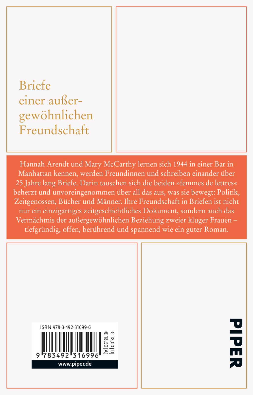 Hannah Arendt und Mary McCarthy lernen sich 1945 in einer Bar in Manhattan kennen, werden Freundinnen und schreiben einander über 25 Jahre lang Briefe. Darin tauschen sich die beiden »femmes de lettres«, die nicht nur leidenschaftlich denken, sondern genauso leben, beherzt und unvoreingenommen über all das aus, was sie bewegt: Politik, Zeitgenossen, Bücher und Männer. Ihre Freundschaft in Briefen ist nicht nur ein einzigartiges zeitgeschichtliches Dokument, sondern auch das Vermächtnis der außergewöhnlichen Beziehung zweier kluger und berühmter Frauen - tiefgründig, offen, berührend und spannend wie ein guter Roman.