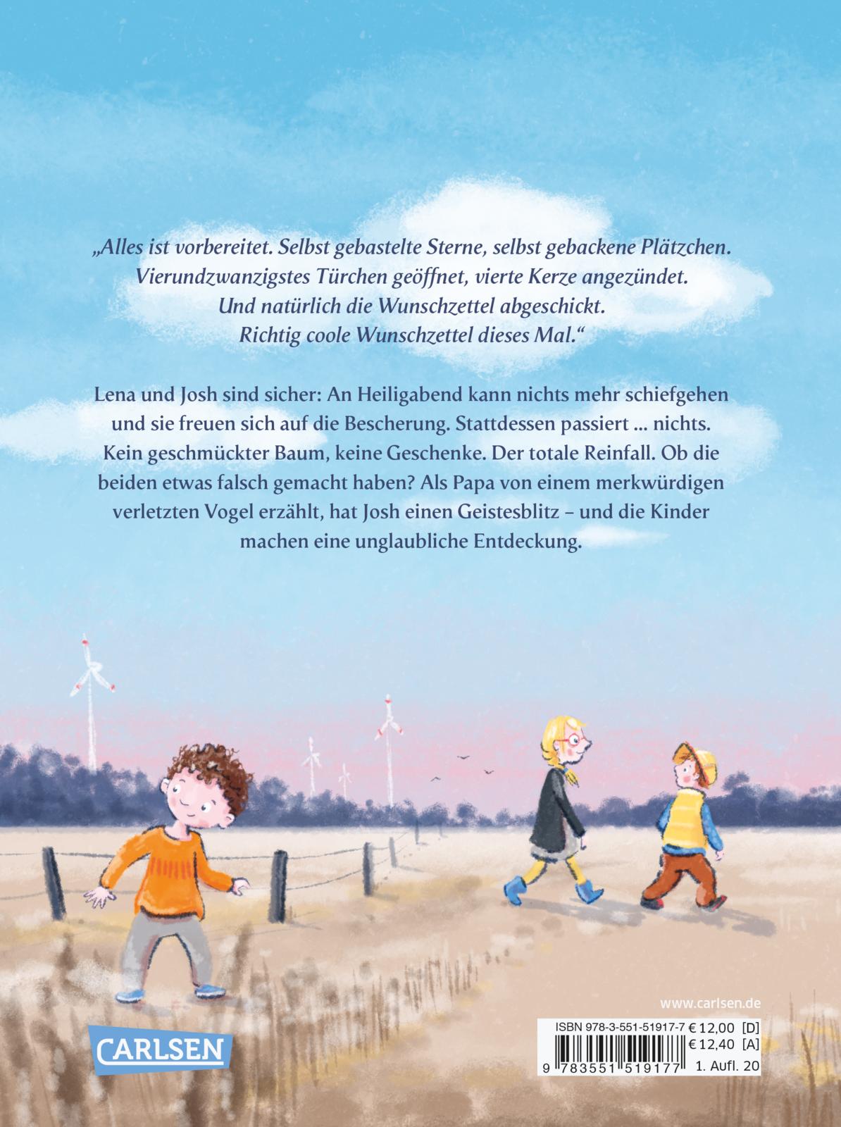 Voller Erwartungen stürmen die beiden ins Wohnzimmer. Aber dann ... nichts. Kein Christkind, keine Bescherung. Nirgends. Der totale Reinfall! Dafür erzählt Papa, passionierter Ornithologe, dass ein merkwürdiger, verletzter Vogel aufgetaucht ist.
