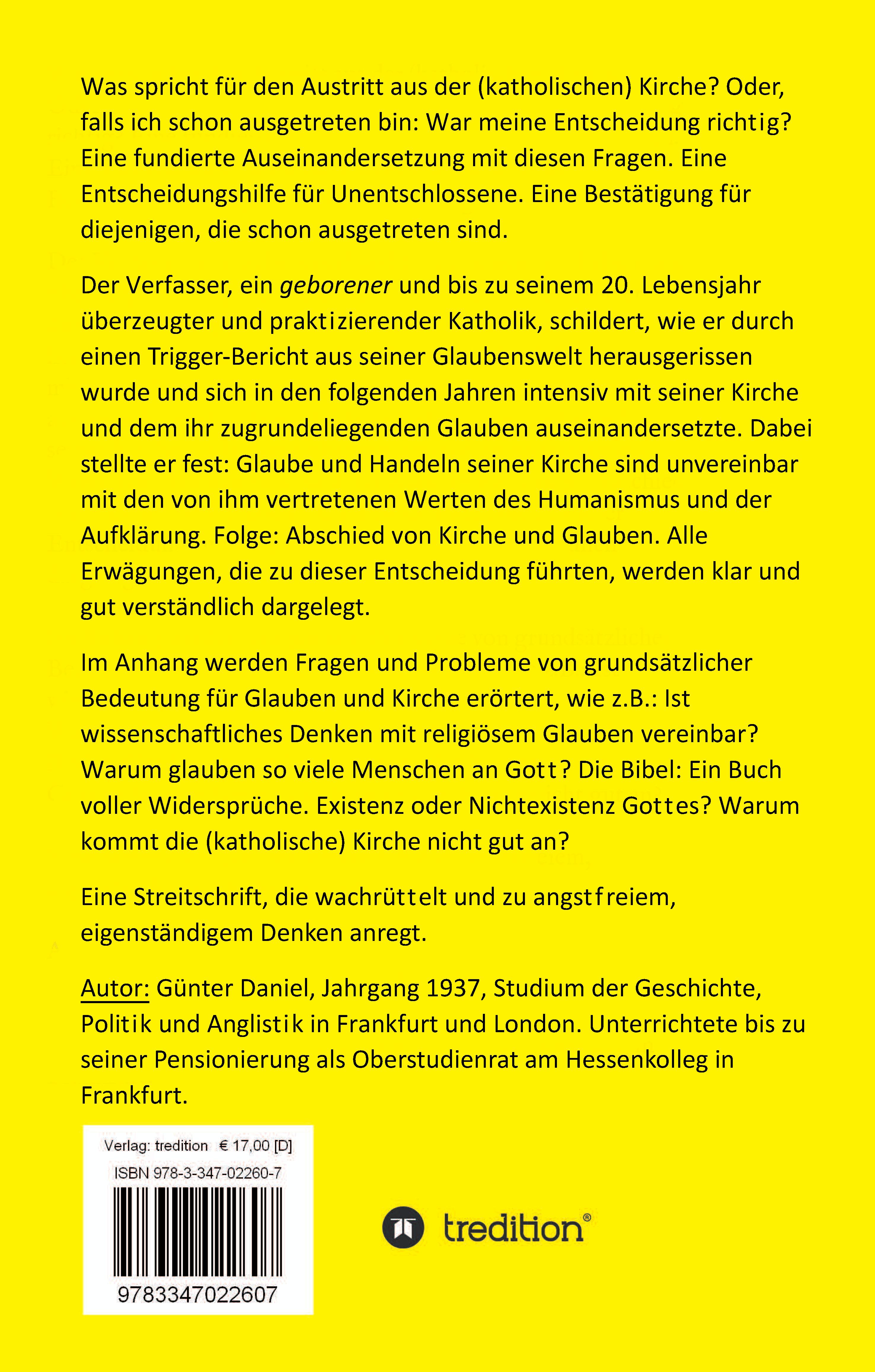 Günter Daniel, Jahrgang 1937, Studium der Geschichte, Politik und Anglistik in Frankfurt und London. Unterrichtete bis zu seiner Pensionierung als Oberstudienrat am Hessenkolleg in Frankfurt. Der Verfasser, ein "geborener" und bis zu seinem 20. Lebensjahr überzeugter und praktizierenden Katholik, schildert, wie er aus seiner Glaubenswelt herausgerissen wurde und sich in den folgenden Jahren intensiv mit seiner Kirche und dem ihr zugrunde liegenden Glauben auseinandersetzte. Dabei stellte er fest: Glaube und Handeln seiner Kirche sind unvereinbar mit den von ihm vertretenen Werten des Humanismus und der Aufklärung. Folge: Abschied von Kirche und Glauben.