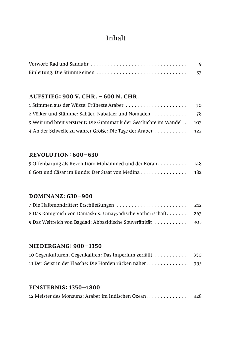 Abbildungen und KartenVorwort: Rad und SanduhrEinleitung: Die Stimmen einenAUFSTIEG: 900 v. Chr. - 600 n. Chr.1 Stimmen aus der Wüste: Früheste Araber2 Völker und Stämme: Sabäer, Nabatäer und Nomaden3 Weit und breit verstreut: Wie die Grammatik der Geschichte sich wandelt4 Am Rand wahrer Größe: Die Tage der AraberREVOLUTION: 600-630 n. Chr.5 Offenbarung als Revolution: Mohammed und der Koran6 Gott und Kaiser im Bund: Das Staatsgebilde von MedinaDOMINANZ: 630-900 n. Chr.7 Die Halbmondritter: Einnehmende Offenheit8 Das Königreich von Damaskus: Umayyadische Vorherrschaft9 Das Weltreich von Bagdad: Abbasidische SchirmherrschaftNIEDERGANG: 900 - 135010 Gegenkulturen, Gegenkalifen: Das Imperium trennt sich11 Der Geist in der Flasche: Die Horden rücken näherFINSTERNIS: 1350 - 180012 Gebieter des Monsuns: Araber im Indischen OzeanWIEDERAUFSTIEG: 1800 - HEUTE13 Identitäre Wiederentdeckung: Erweckungen14 Das Zeitalter der Hoffnung: Nasserismus, Baathismus, Befreiung, Öl15 Das Zeitalter der Ernüchterung: Autokraten, Islamokraten,AnarcharchenNachwort: Am Bahnhof der GeschichteAnhangZeittafelnAnmerkungenLiteraturverzeichnisIndex