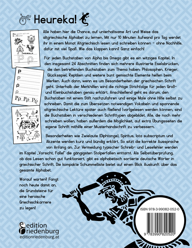VorwortEine wichtige Tatsache vorab: Dieses Buch sorgt in kürzester Zeit dafür, dass du als absoluter Schlaumeier durch die Decke gehst. Altgriechisch lesen zu können, ist zwar nicht alles, aber ein wichtiger Teil auf dem Weg zum Sokrates. Lass dir von ihm und seinen Freunden dabei helfen, das altgriechische Alphabet von Alpha bis Omega zu bezwingen.So benutzt du dieses Buch:Wenn du Altgriechisch noch gar nicht beherrschst, beginne am besten ganz von vorne bei Alpha. Solltest du bereits Vorkenntnisse haben und nur ein paar Buchstaben wiederholen wollen, kannst du natürlich auch direkt zur gewünschten Seite springen.Damit du dir die Buchstaben möglichst gut einprägst, folge diesem Lernprinzip:1. Sprich den passenden Merksatz laut aus, also zum Beispiel "Alpha spricht sich wie A in Astronomie".2. Schau dir den Buchstaben genau an: Wie sieht der Großbuchstabe aus? Wie sieht der Kleinbuchstabe aus? 3. Fahre mit dem Finger die großen Übungsbuchstaben unten auf der Seite langsam nach, und zwar zuerst den Großbuchstaben und dann den Kleinbuchstaben. Die nummerierten Pfeile helfen dir bei der richtigen Strichreihenfolge. Wichtig dabei: Setze den Finger und später den Stift nur dann ab, wenn es außer dem ersten noch weitere nummerierte Pfeile gibt. Ansonsten solltest du den Buchstaben in einem Zug durchschreiben.4. Sieh dir die Illustrationen oberhalb der großen Übungsbuchstaben gut an. Hier verstecken sich verschiedene Eselsbrücken, die dir dabei helfen, den Buchstaben dauerhaft im Kopf zu behalten. Schau genau hin: Die Groß- und Kleinbuchstaben sind teils recht gut in den Bildern versteckt. Du wirst überrascht sein, was du alles entdeckst.5. Übung macht den Meister: Auf der rechten Seite hast du Platz, die in der Computerschrift vorgedruckten Groß- und Kleinbuchstaben selber aufzuschreiben. Drei Schriftmuster verschiedener Schrifttypen mit Serifen zeigen dir auf der untersten Zeile, wie die Buchstaben auch aussehen könnten. Blättere anschließend um. Nun findest du drei weitere Übungsseiten, auf denen du deine Handschrift perfektionieren kannst. Mustergültige handgeschriebene Buchstaben machen dir eine mögliche Schreibweise vor.6. Zur Belohnung gibt es am Schluss jedes Kapitels einen ganz speziellen Arbeitsauftrag. Hier sind die gerade geübten Buchstaben und/oder ihre Merkhilfen meistens gut versteckt. So kannst du dein Wissen nochmals auf amüsante Weise festigen.Investiere jeden Tag nur 10 Minuten und pflüge dich in rund einem Monat durch das gesamte altgriechische Alphabet. Wenn du dir im Anschluss an die einzelnen Buchstaben auch noch die Spezialitätenseiten wie Zwielaute, Spiritus asper, Spiritus lenis und Akzente vornimmst, ist schon bald kein griechischer Text mehr vor dir sicher! Typische Fallen haben wir nämlich für dich enttarnt. Eine Übungsliste mit deutschen Begriffen in griechischen Lettern findest du als krönenden Abschluss, bevor du mit der Schummelliste das gesamte Alphabet wiederholst.Los geht's auf Zeitreise zu den steinalten Griechen! Viel Spaß dabei wünschen dir die Autorinnen