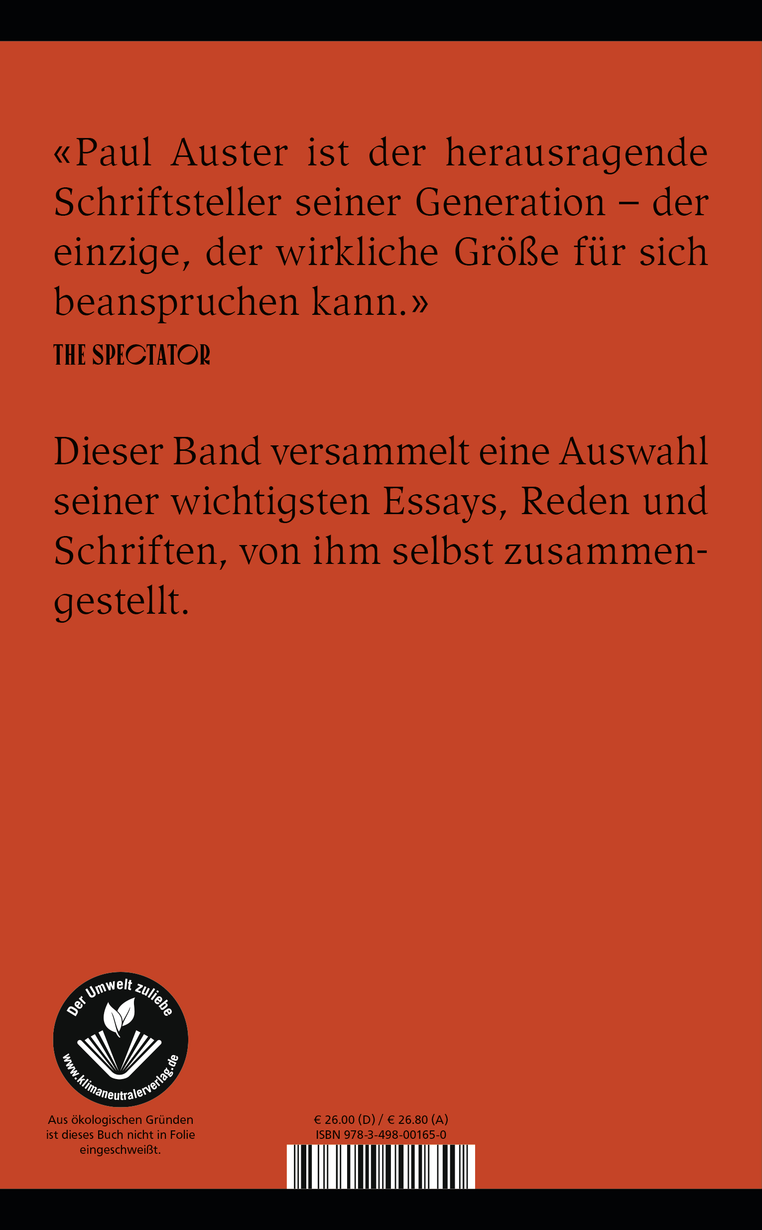 Beginnend mit einer kurzen philosophischen Betrachtung, die er mit zwanzig schrieb, und schließend mit einer Reihe von politischen Texten über Themen wie Obdachlosigkeit, 9/11 oder den Zusammenhang zwischen Fußball und Krieg, bieten die 44 Stücke dieser Auswahl einen großen Überblick über Austers Ansichten zu klassischen und zeitgenössischen Schriftstellern, zur Hochseilartistik von Philippe Petit, zu seinen Kunstaktionen mit Sophie Calle und dem langen Weg, den er mit seiner geliebten mechanischen Schreibmaschine zurückgelegt hat.