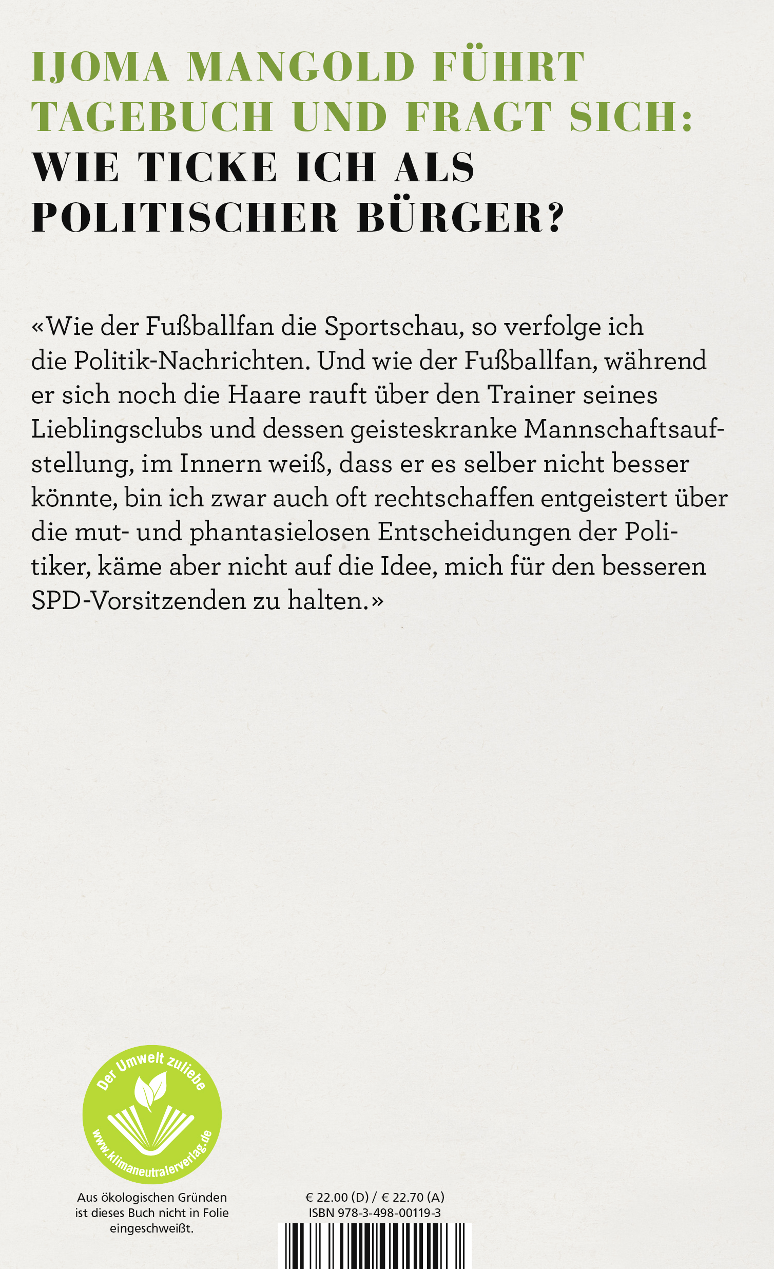 Die alte Eindeutigkeit ist aus der Politik verschwunden. Sie wurde ersetzt durch Reflexe und Schnappatmung, durch Wut und Widersprüchlichkeit. Doch gerade dieses Unreflektierte, die Affekte, der Stammtisch, der permanent nur für uns selbst in uns zu hören ist, ist das, so Mangold, was das Politische im Tiefsten ausmacht. Wie wir zu Meinungen kommen, wie wir es uns gemütlich einrichten mit ihnen und wie wir sie im besten Fall auch mal wieder loswerden - darum geht es in diesem Buch der Selbstbeobachtung. Es ist ein Text der Zeitdiagnostik entstanden, der eine Darstellung des politischen Gegenwartstheaters durch einen aufmerksamen Insider ist und gleichzeitig eine politische Anthropologie.