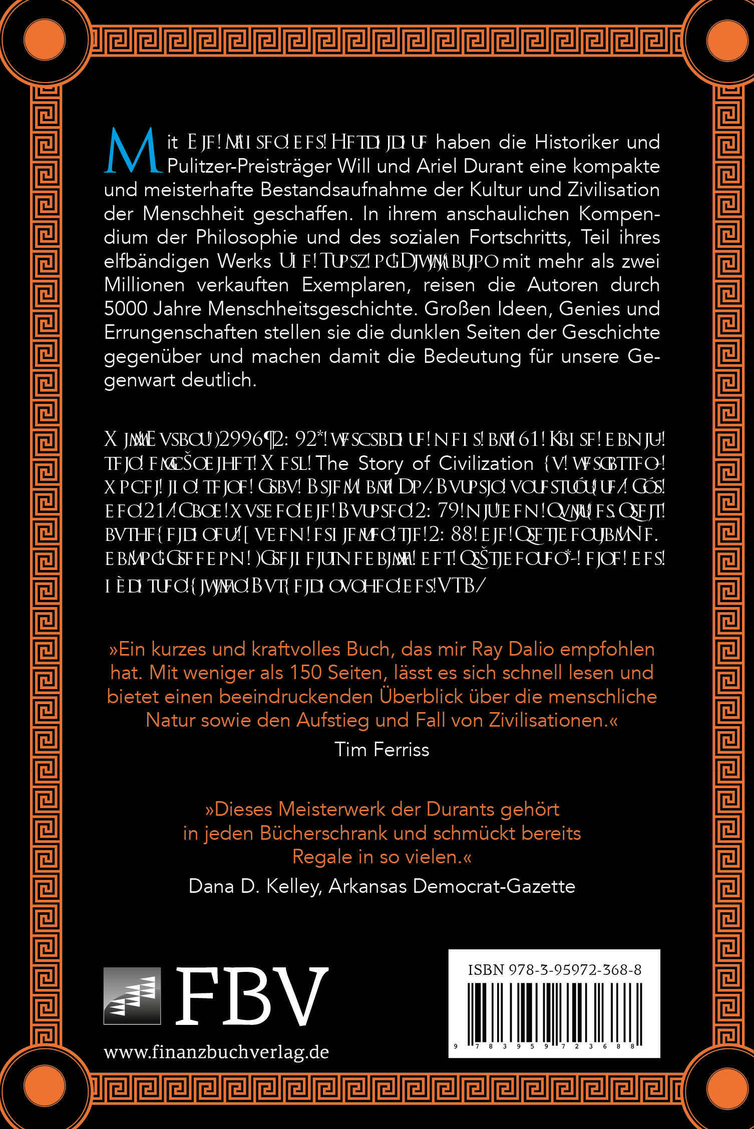 »Sie waren bestimmt die besten Historiker aller Zeiten.« Ray Dalio über Will und Ariel Durant »Nur ein Narr würde versuchen, Jahrhunderte in hundert Seiten mit gefährlichen Schlussfolgerungen zu verdichten. Wir fahren fort.« Disclaimer von Will und Ariel Durant »Ein kurzes und kraftvolles Buch, das mir Ray Dalio empfohlen hat. Mit weniger als 150 Seiten, lässt es sich schnell lesen und bietet einen beeindruckenden Überblick über die menschliche Natur sowie den Aufstieg und Fall von Zivilisationen.« Tim Ferriss »Dieses Meisterwerk der Durants gehört in jeden Bücherschrank und schmückt bereits Regale in so vielen.« Dana D. Kelley, Arkansas Democrat-Gazette