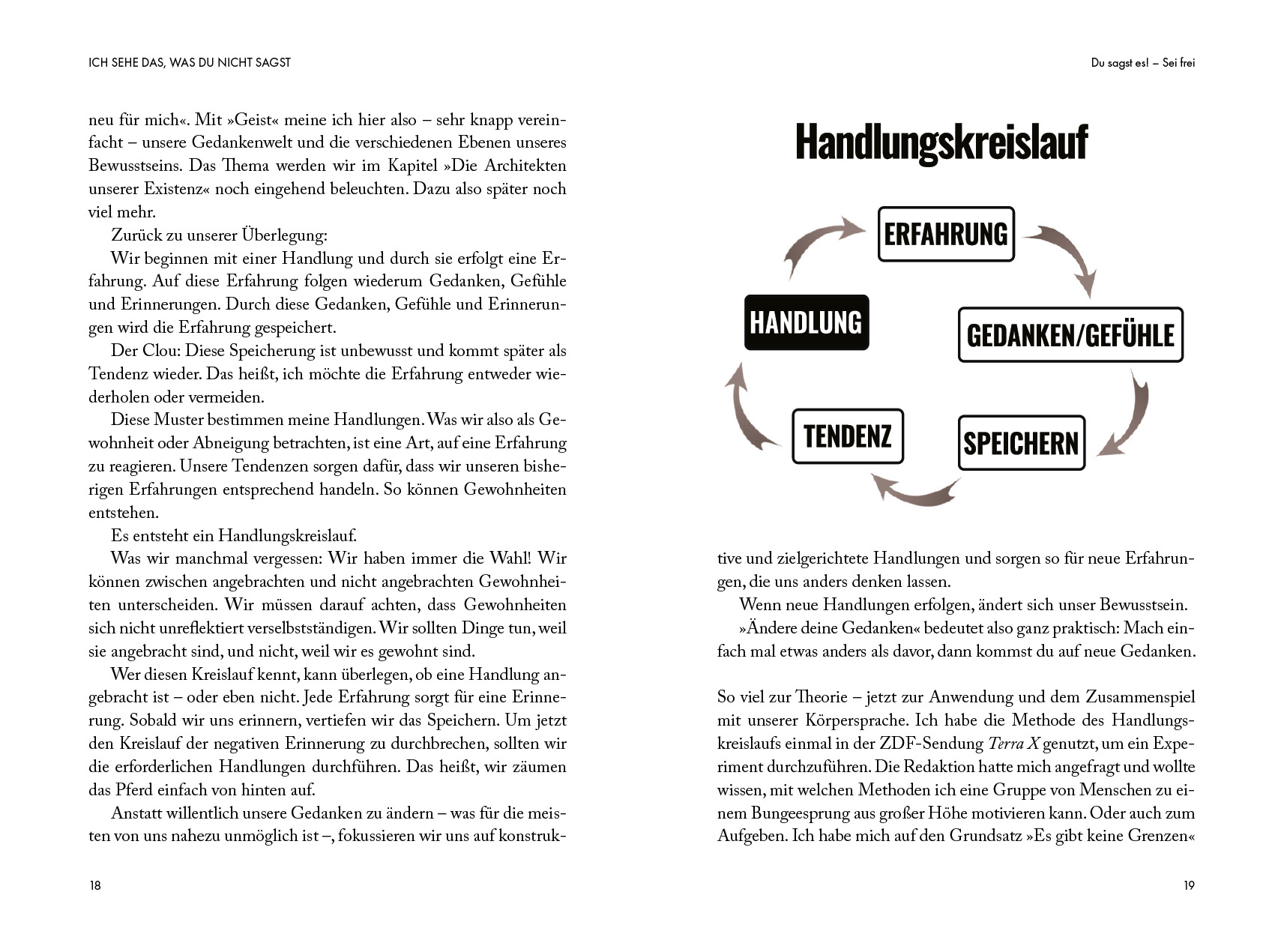 Wie können wir die Körpersprache anderer Menschen lesen, verstehen und übersetzen? Wie können wir Vertrauen und Harmonie herstellen? Wie wirken wir souverän und überzeugend? Um andere zu verstehen, müssen wir zunächst begreifen, wie wir selbst denken und wie eng unsere Gedanken mit unseren Handlungen verknüpft sind. Erst dann, im zweiten Schritt, können wir den Blick auf unsere Mitmenschen richten, um diese zu entschlüsseln. Wie das geht, zeigt der Bestsellerautor und Mentalist Thorsten Havener in seinem neuen Buch mit ganz praktischen Methoden. Er beschreibt hier zum ersten Mal ein psychologisches System, das uns zeigt, wie die Gedanken anderer auch ohne gesprochene Worte sichtbar werden – durch reine Wahrnehmung und genaues Beobachten.