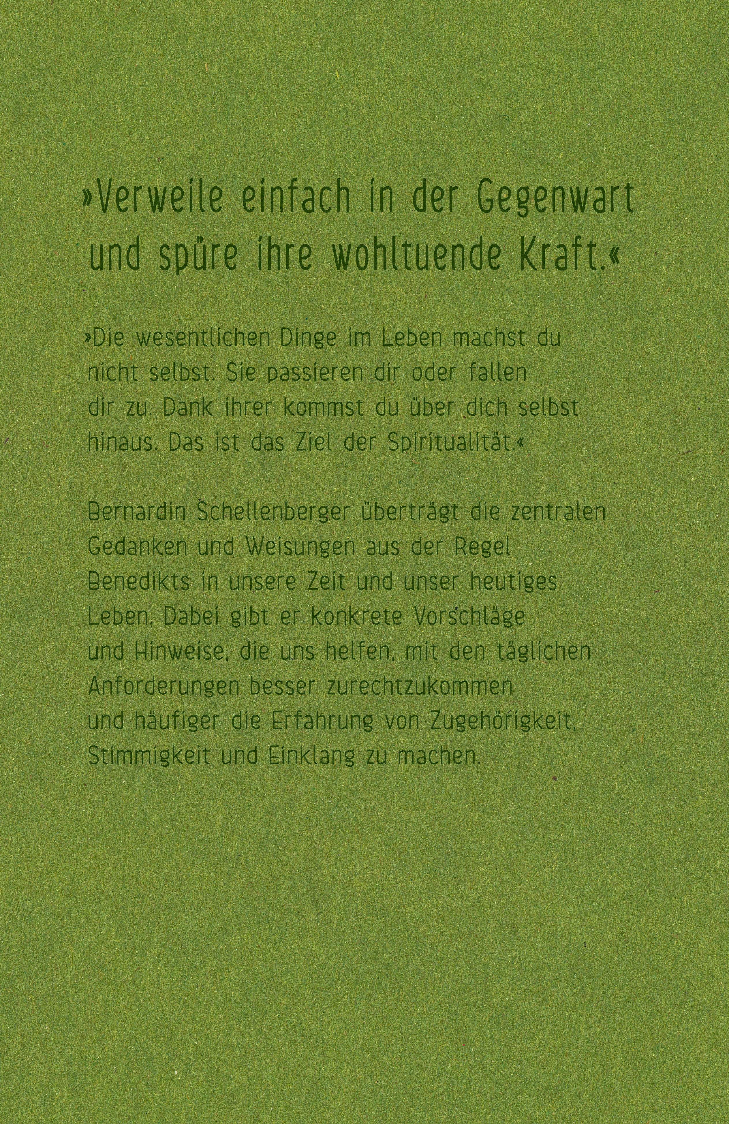 »Verweile einfach in der Gegenwart und spüre ihre wohltuende Kraft.«»Die wesentlichen Dinge im Leben machst du nicht selbst. Sie passieren dir oder fallen dir zu. Dank ihrer kommst du über dich selbst hinaus. Das ist das Ziel der Spiritualität.«Bernardin Schellenberger überträgt die zentralen Gedanken und Weisungen aus der Regel Benedikts in unsere Zeit und unser heutiges Leben. Dabei gibt er konkrete Vorschläge und Hinweise, die uns helfen, mit den täglichen Anforderungen besser zurechtzukommen und häufiger die Erfahrung von Zugehörigkeit, Stimmigkeit und Einklang zu machen. Das Buch ist die überarbeitete und erheblich erweiterte Neuausgabe des 2005 im Kreuz Verlag erschienenen Titels 'Mit Benedikt Spiritualität erfahren'.