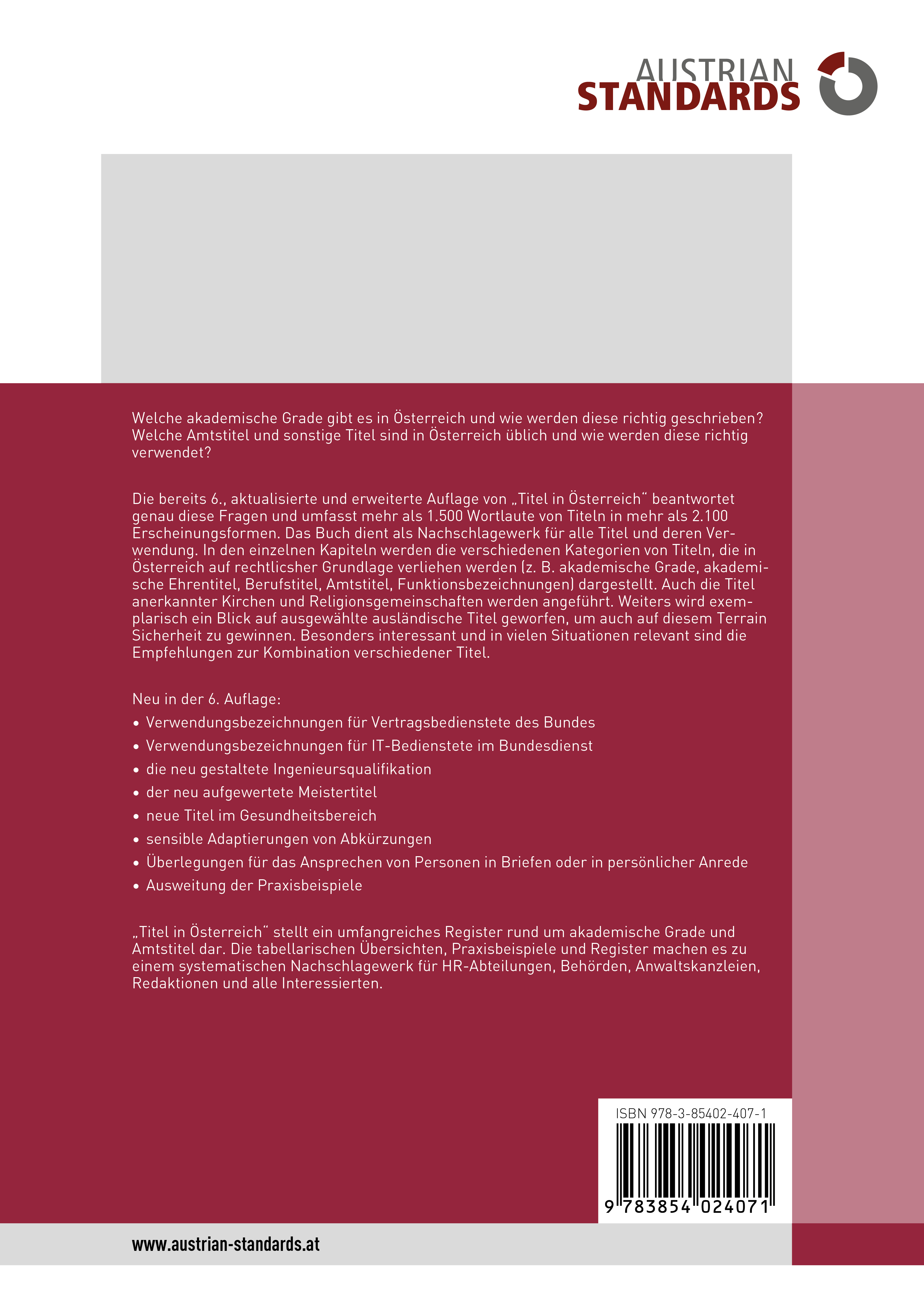 Die bereits 6., aktualisierte und erweiterte Auflage von "Titel in Österreich" beantwortet genau diese Fragen und umfasst mehr als 1.500 Wortlaute von Titeln in mehr als 2.100 Erscheinungsformen. Das Buch dient als Nachschlagewerk für alle Titel und deren Verwendung. In den einzelnen Kapiteln werden die verschiedenen Kategorien von Titeln, die in Österreich auf rechtlicher Grundlage verliehen werden (z. B. akademische Grade, akademische Ehrentitel, Berufstitel, Amtstitel, Funktionsbezeichnungen) dargestellt. Auch die Titel anerkannter Kirchen und Religionsgemeinschaften werden angeführt. Weiters wird exemplarisch ein Blick auf ausgewählte ausländische Titel geworfen, um auch auf diesem Terrain Sicherheit zu gewinnen. Besonders interessant und in vielen Situationen relevant sind die Empfehlungen zur Kombination verschiedener Titel.