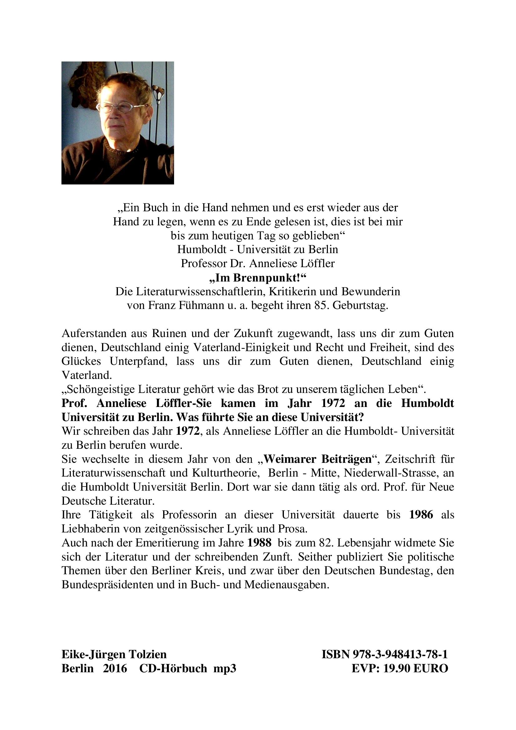 Anneliese Löffler, vormals Große (* 7. Mai 1928 in Folbern ), ist eine deutsche Germanistin und Literaturwissenschaftlerin. Im Jahr 1971 wurde Löffler Mitglied des Berliner Schriftstellerverbandes, in dem sie zeitweilig Vorstandsmitglied des Berliner Bezirksverbands war. Im Jahr 1972 erhielt sie Professur für DDR-Literatur an der Humboldt-Universität zu Berlin. Seit dem Jahr 2011 sind viele Bücher, Hörbücher, DVDs und CD-ROMs von ihr erschienen. Während ihrer wissenschaftlichen Tätigkeit hat sich mit der Zeit viel Material angesammelt, das sie nun veröffentlicht. Vorher war dafür keine Zeit übrig-sie diente allein der Wissenschaft.