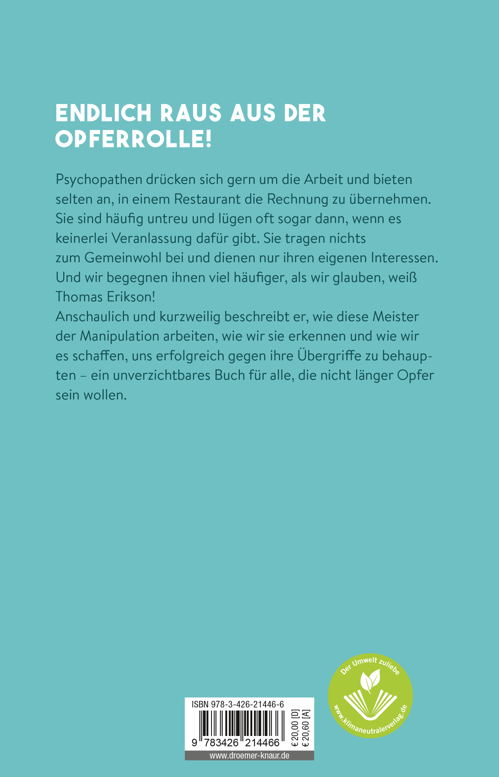 Selbstbehauptung kann man lernen, so der schwedische Selbst-Coaching-Experte Thomas Erikson. Sein neues Sachbuch beschreibt und erklärt den erfolgreichen Umgang mit Menschen, die uns ausnutzen und manipulieren - denn keiner muss Opfer sein!