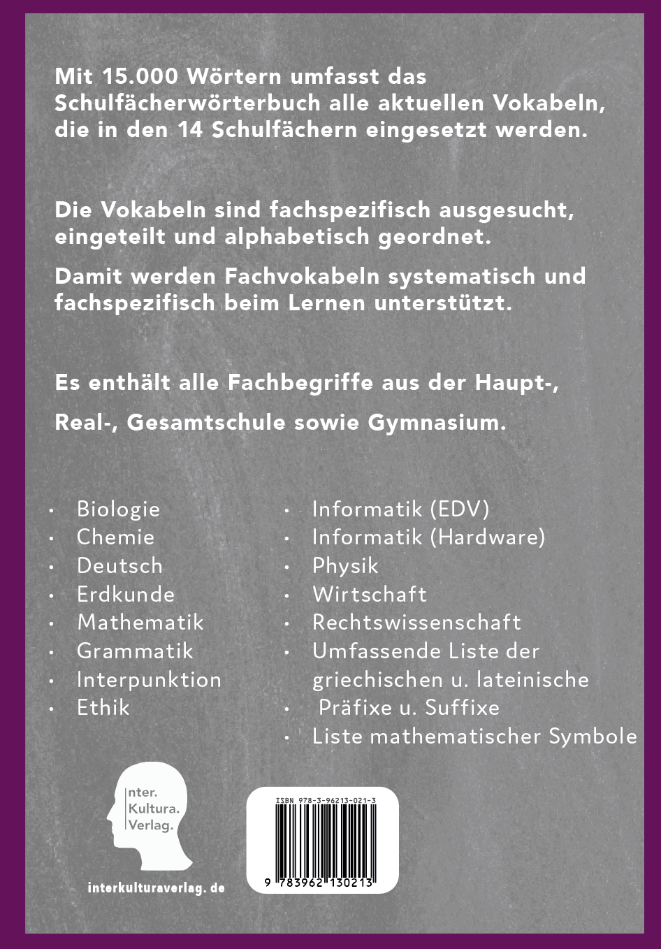 Mit 12000 Wörtern umfasst das Schulfächerwörterbuch alle aktuellen Vokabeln, die in den 24 Schulfächern eingesetzt werden. Das Wörterbuch kombiniert und umfasst die wichtigsten Vokabeln des Schullebens.Die Vokabeln sind fachspezifisch ausgesucht, eingeteilt und alphabetisch geordnet. Damit wird das Lernen von Fachvokabeln systematisch und fachspezifisch unterstützt.Es enthält alle Fachbegriffe aus der Haupt-, Real- und Gesamtschule sowie aus dem Gymnasium.- 3.500 Begriffe, 500 Redewendungen für 15 Schulfächer bis zur zehnten Klasse- Basierend und abgestimmt auf die Lehrpläne aller Bundesländer- Für alle Schulformen, Integrationskurse und das Selbststudium