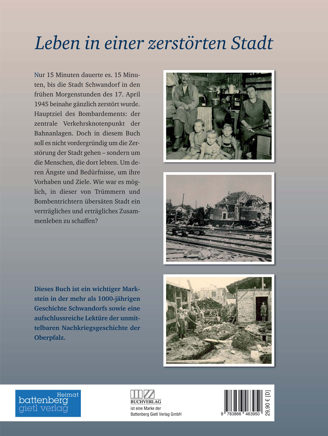 In den frühen Morgenstunden des 17. April 1945 wird die Stadt Schwandorf innerhalb von 15 Minuten zu über 70 Prozent zerstört. Hauptziel dieses Bombardements war zweifellos der zentrale Verkehrsknotenpunkt der Bahnanlagen. Dieses Buch behandelt nicht vordergründig die Zerstörung, sondern stellt die Menschen (Militärregierung, verantwortliche Kommunalpolitiker, Einheimische, Flüchtlinge und Vertriebene) mit all ihren Bedürfnissen, Ängsten und Zielen in den Mittelpunkt. Wie war es möglich, in einer von Trümmern und Bombentrichtern übersäten Stadt ein verträgliches und auch erträgliches Zusammenleben zu gewährleisten? Das chronologisch aufgebaute Buch versucht diese und weitere Fragen zu beantworten. Die über 200 Bekanntmachungen der Militärregierung bilden sozusagen den "roten Faden". Welche Schwierigkeiten die Umsetzung dieser Anordnungen oftmals mit sich brachte, wird durch viele Berichte (Gesundheit, Polizei, Wiederaufbau) eindrucksvoll untermauert. Bei der Bebilderung wurde zwangsläufig, da durch die Militärregierung ein Fotografierverbot verhängt wurde, auf Fotomaterial mit Aufnahmen einer zerstörten Stadt zurückgegriffen.Das Buch ist ein wichtiger Markstein in der mehr als 1000-jährigen Geschichte Schwandorfs, soll jedoch durchaus auch als aufschlussreiche Lektüre der unmittelbaren Nachkriegsgeschichte der Oberpfalz und darüber hinaus verstanden werden.