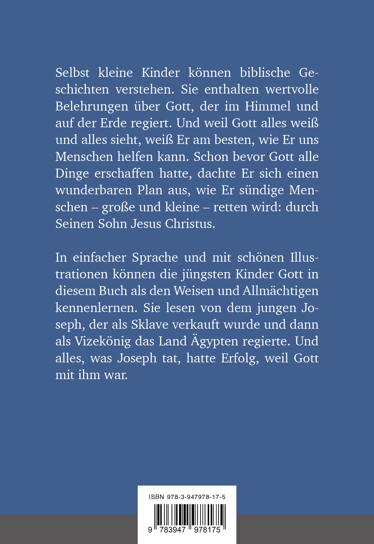 In einfacher Sprache und mit schönen 4-farbigen Illustrationen können die jüngsten Kinder Gott in diesem Buch als den Weisen und Allmächtigen kennenlernen. Sie lesen von dem jungen Joseph, der als Sklave verkauft wurde und dann als Vizekönig das Land Ägypten regierte. Und alles, was Joseph tat, hatte Erfolg, weil Gott mit ihm war.