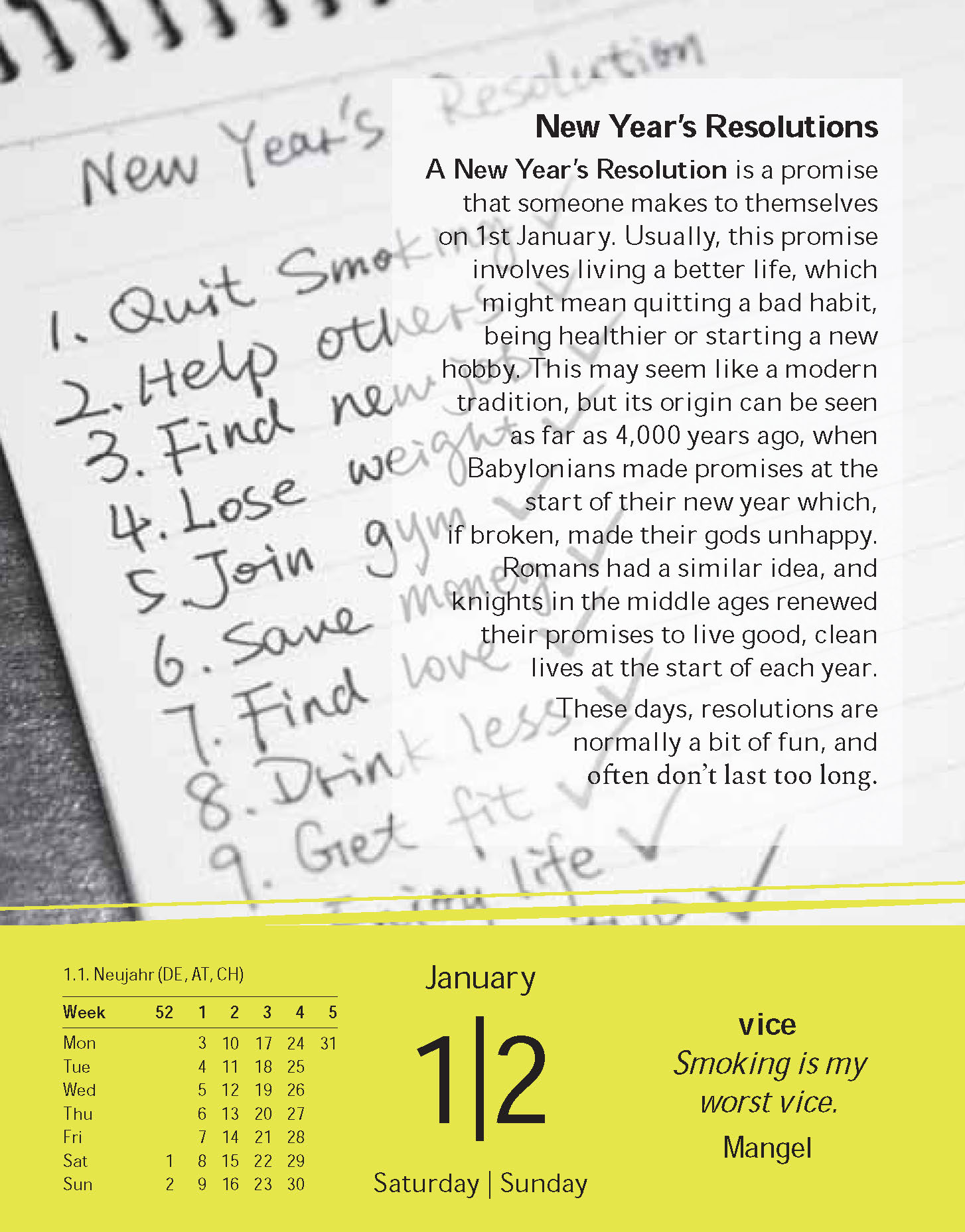 - Jedes Kalenderblatt mit Vokabel des Tages inklusive Übersetzung und Beispielsatz