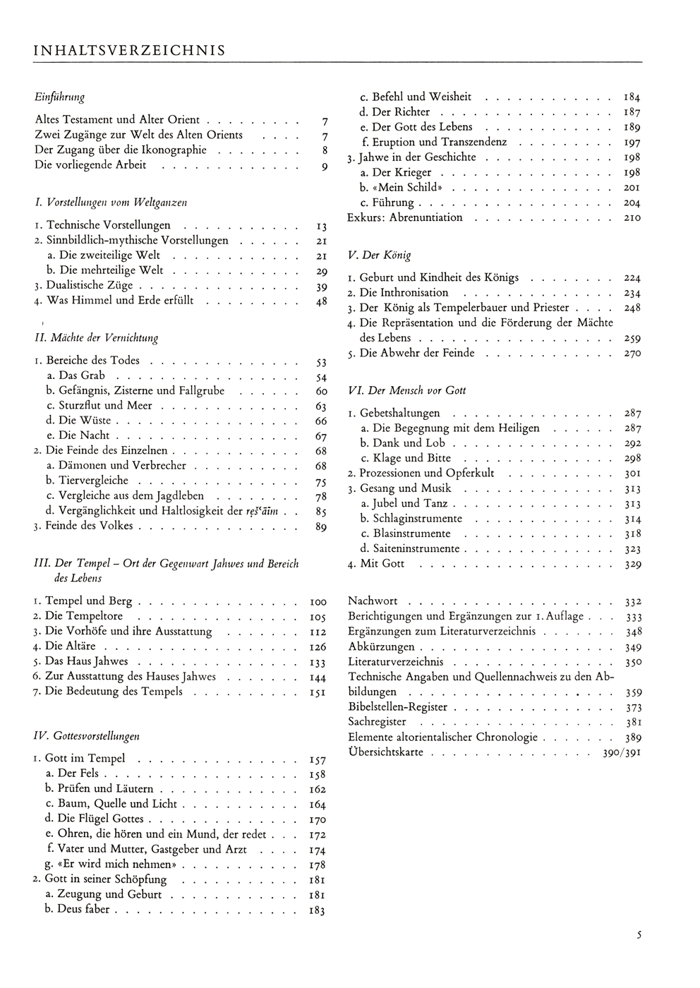 EinführungAltes Testament und Alter OrientZwei Zugänge zur Welt des Alten OrientsDer Zugang über die IkonographieDie vorliegende ArbeitI. Vorstellung vom Weltganzen1. Technische Vorstellungen2. Sinnbildlich-mythische Vorstellungen3. Dualistische Züge4. Was Himmel und Erde erfülltII. Mächte der Vernichtung1.Bereiche des Todes2.Die Feinde des Einzelnen3.Feinde des VolkesIII. Der Tempel - Ort der Gegenwart Jahwes und Bereich des Lebens1.Tempel und Berg2.Die Tempeltore3.3. Die Vorhöfe und ihre Ausstattung4.Die Altäre5.Das Haus Jahwes6.6. Zur Ausstattung des Hauses Jahwes7. Die Bedeutung des TempelsIV. Gottesvorstellungen1.Gott im Tempel2.Gott in seiner Schöpfung3.3. Jahwe in der GeschichteExkurs: AbrenuntiationV. Der König1. Geburt und Kindheit des Königs2. Die Inthronisation3. Der König als Tempelerbauer und Priester4. Die Repräsentation und die Förderung der Mächte des Lebens5. Die Abwehr der FeindeVI. Der Mensch vor Gott1.Gebetshaltungen2. Prozessionen und Opferkult3. Gesang und Musik4. Mit GottNachwortBerichtigungen und Ergänzungen zur 1 AuflageErgänzungen zum LiteraturverzeichnisAbkürzungenLiteraturverzeichnisTechnische Angaben und Quellennachweis zu den AbbildungenBibelstellen-RegisterSachregisterElemente altorientalischer ChronologieÜbersichtskarte