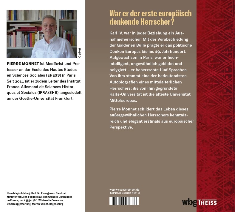 Karl IV., der »größte römisch-deutsche Kaiser des Spätmittelalters« (Peter Moraw), war in jeder Beziehung ein Ausnahmeherrscher. Seine bis heute bekannteste Leistung ist die Verabschiedung der Goldenen Bulle, der 'Verfassung' des Heiligen Römischen Reiches. Karls ungewöhnlich lange Herrschaft fällt in die Zeit der Krise des 14. Jahrhunderts, geprägt vom 100-jährigen Krieg, Großer Pest und Abendländischen Schisma. Aufgewachsen in Paris, war Karl hochintelligent, ungewöhnlich gebildet und polyglott (er sprach fünf Sprachen). Von ihm stammt die einzige Autobiografie eines mittelalterlichen Herrschers; die von ihm gegründete Karlsuniversität ist die älteste Universität Mitteleuropas. Und kein mittelalterlicher Herrscher wurde so oft porträtiert.Pierre Monnet schreibt die erste moderne Biografie des großen spätmittelalterlichen Kaisers seit über 30 Jahren. Der Spezialist für das Spätmittelalter verbindet größte Gelehrsamkeit mit französisch elegantem Stil.