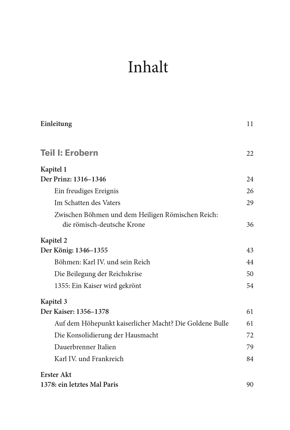Einleitung 11Teil I: Erobern 22Kapitel 1 Der Prinz: 1316-1346 24Ein freudiges Ereignis 26Im Schatten des Vaters 29Zwischen Böhmen und dem Heiligen Römischen Reich: die römisch-deutsche Krone 36Kapitel 2 Der König: 1346-1355 43Böhmen: Karl IV. und sein Reich 44Die Beilegung der Reichskrise 501355: Ein Kaiser wird gekrönt 54Kapitel 3 Der Kaiser: 1356-1378 61Auf dem Höhepunkt kaiserlicher Macht? Die Goldene Bulle 61Die Konsolidierung der Hausmacht 72Dauerbrenner Italien 79Karl IV. und Frankreich 84Erster Akt 1378: ein letztes Mal Paris 90 Teil II: Herrschen 104Kapitel 4 Ländernamen 106Das Luxemburg der Luxemburger 106Böhmen: vom Herzogtum zum Königreich 108Von den Premysliden zu den Luxemburgern 112Drei Kronen für ein Reich 115Kapitel 5 König sein 122Identität als Person, Identität als König 122Siegel und Kronen 127Der König und seine Königinnen 134Kapitel 6 Regieren 138Die Reichsvikariate 141Kanzler, Berater und Finanziers 144Prag: der Regierungssitz 150Nürnberg: die Nebenhauptstadt 158Aufenthalte und Reisen 162 Kapitel 7 Karl IV. und die Städte 165Ein vorhandenes Netzwerk 166Eine flexible Politik 167Verschleuderte Städte? 172Städte als Regierungsstützpunkte 175Zweiter Akt 1378: die letzte Station oder Tod in Prag 179Teil III: Überdauern 184Kapitel 8 Schriften und Reliquien 186Ein gelehrter König: Gedenken und Autorität des Geschriebenen 186Die Autobiografie: über sich selbst schreiben 190Die Schriften des Herrschers 195Die Leidenschaft für Reliquien 199Kapitel 9 Karl IV. in seinen Porträts 210Den König zeigen 213Karl IV. in Bild und Wort 215Porträts und Kryptoporträts unterschiedlicher Tradition 219Karls Bild in Prag: Karlsbrücke und Veitsdom 222Karlstein oder die Obsession für königlich-kaiserliche Erhabenheit 228Das Bild des Königs im Schnittpunkt von Zeit und Raum 237In Stein gemeißelt 242 Kapitel 10Der König der anderen 250Pro und kontra: das facettenreiche Bild im 14. Jahrhundert 255Im 15. Jahrhundert: Das Scheitern der Luxemburger befleckt Karl IV. - und wäscht ihn wieder rein 265Nach dem 16. Jahrhundert: geografische Einengung und Wandel des karolinischen Andenkens 269Karl IV. als romantischer Nationalheld des 19. Jahrhunderts 274Karl IV. in den Turbulenzen des 20. Jahrhunderts 278Dritter Akt In der Waagschale: Wer war Karl IV.? 287Karl IV. - eine Bilanz 290Dank 297Anhang 301Stammtafel der Luxemburger 303Karten 304Chronologie 309Anmerkungen 312Weiterführende Literatur 344Personenregister 354Ortsregister 360Abbildungsnachweis 365
