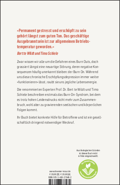 Die renommierten Experten Prof. Dr. Bert te Wildt und Timo Schiele beschreiben erstmals das Burn-On-Syndrom, bei dem es trotz hohen Leidensdrucks nicht mehr zum Zusammenbruch, wohl aber zu gravierenden seelischen und körperlichen Folgen kommt.
