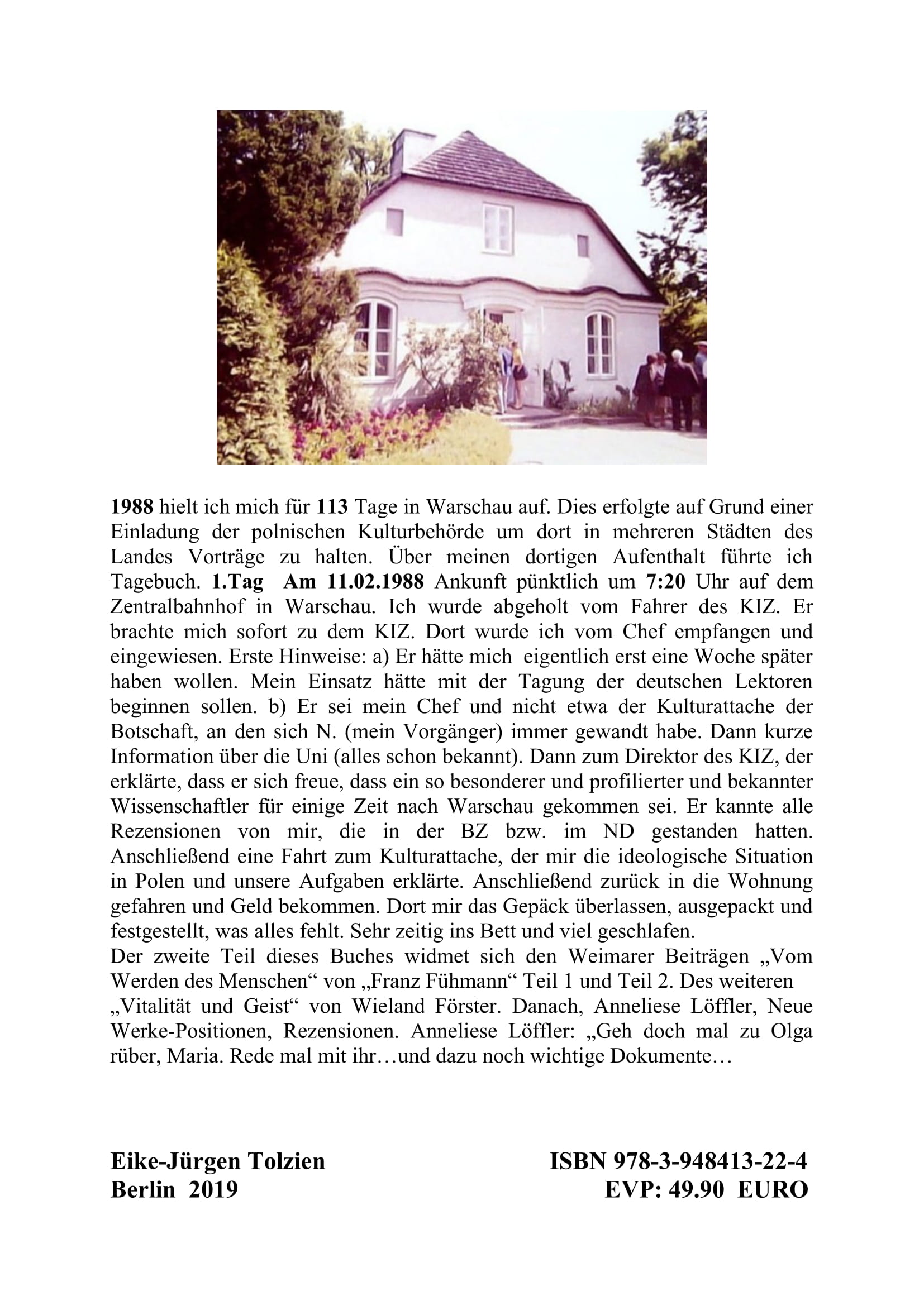 Der zweite Teil dieses Buches widmet sich den Weimarer Beiträgen „Vom Werden des Menschen“ von „Franz Fühmann“ Teil 1 und Teil 2. Des weiteren „Vitalität und Geist“ von Wieland Förster. Danach, Anneliese Löffler, Neue Werke-Positionen, Rezensionen. Anneliese Löffler: „Geh doch mal zu Olga rüber, Maria. Rede mal mit ihr…und dazu noch wichtige Dokumente… Auch als CD-ROM unter der ISBN 978-3-948413-37-8 bestellbar.