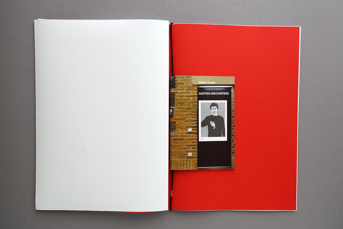 In der Mitte eingelegt ist ein rotes gefaltetes Blatt, das auf die dominante Farbe im Kulturzentrum anspielt und weitere eingelegte Bestandteile separiert: ein Motiv auf A4 und ein Heft, das die Bildwörter in Gegenüberstellung mit Fotos von Situationen im Ausstellungsraum zeigt, mit Text von Albert Coers, deutsch/englisch. Als Umschlag sind, wie in der Ausstellung, Drucke auf Klebefolie verwendet, die abgezogen und aufgeklebt werden können. Die Motive für Umschlag und eingelegtes Blatt wechseln, so dass jedes Exemplar den Charakter eines Unikats hat (Umschlag: “jetzt”, “Buch”, “innen”,“Kapitalismus”,“Bild”, “Wind”; eingelegte Motive: “rot”, “aufmerksam”, “fertig”).