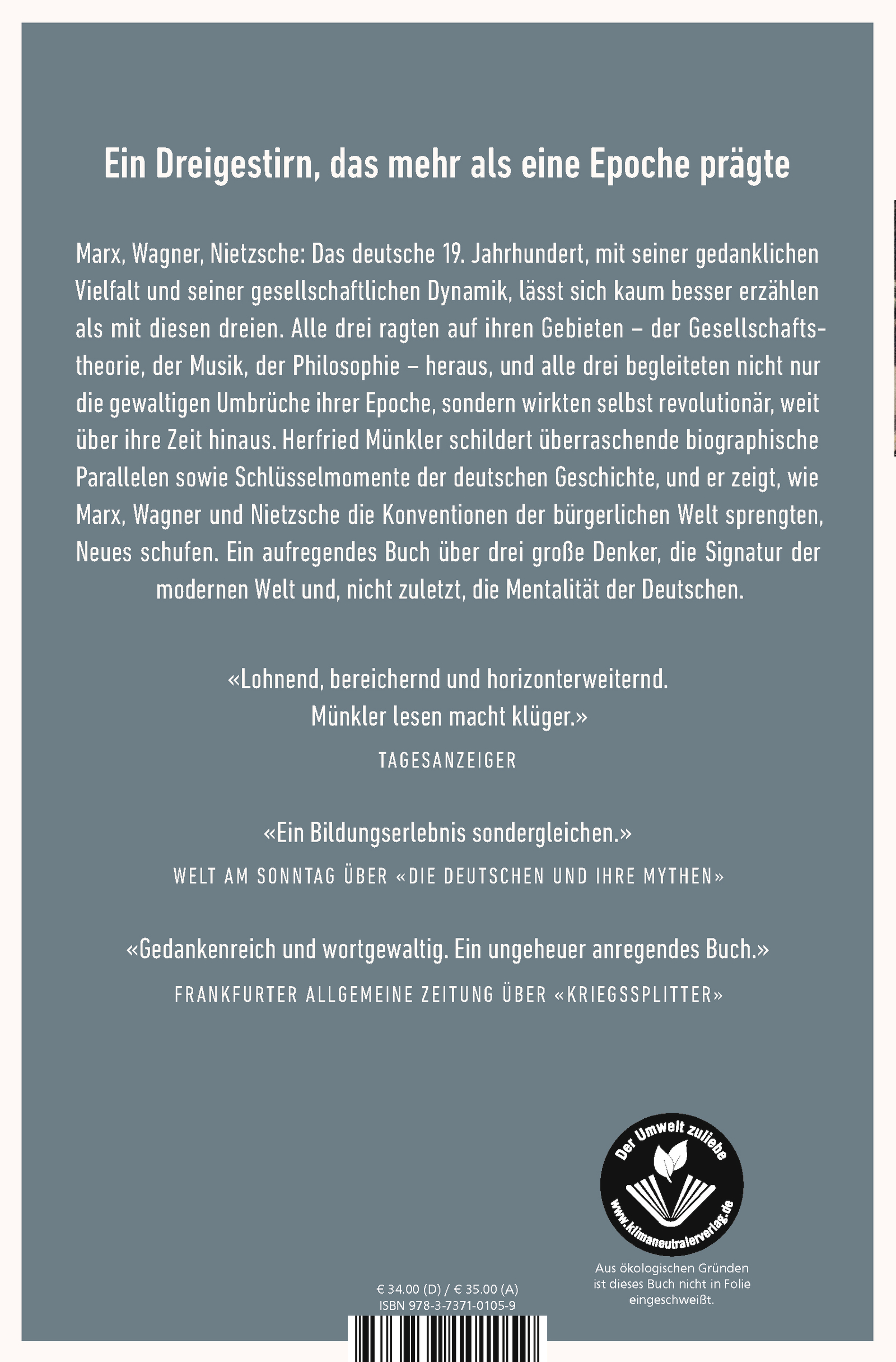 Herfried Münkler folgt diesen drei faszinierenden Gestalten und ruft damit eine ganze Epoche wach. Er schildert die verblüffenden Parallelen im Leben von Marx und Wagner: die Beteiligung an der 1848er-Revolution, Flucht, Vertreibung und Exil, vielerlei Wirren und dann doch das Schaffen eines überragenden Werkes, die Bildung einer großen Anhängerschaft und die schwierige Verantwortung für das, was diese Anhängerschaft aus den Entwürfen gemacht hat. Nietzsche, der etwas Jüngere, ist dann ein philosophisches Ereignis, wie Marx prägt er Generationen. Alle drei sprengen die Konventionen der bürgerlichen Welt, erschaffen Neues – das aber dann zu einer anderen, unerwarteten Wirklichkeit wird: Das so vielversprechende, reiche deutsche 19. Jahrhundert geht über ins Zeitalter der Extreme, der politischen Katastrophen.