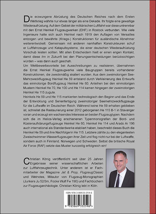 Heinkels He 59 und He 115 markierten technologisch den Beginn und das Ende der Entwicklung und Serienfertigung zweimotoriger Seemehrzweckflugzeuge für die Luftwaffe im Deutschen Reich. Während keine He 59 erhalten geblieben ist, schreitet die Restaurierung einer 2012 geborgenen He 115 B-1 in Stavanger voran und erzeugt ein wachsendes Interesse an beiden Flugzeugtypen. Nachdem sich die im Helios-Verlag erschienenen Typenmonografien der Bord- und Küstenaufklärungsflugzeuge Heinkel He 60, Heinkel He 114 und Arado Ar 196 auch international als Standardwerke etabliert haben, beschreibt dieses Buch die Heinkel He 59 und ihre Nachfolgerin He 115. Letztere zählte zu den elegantesten Zweischwimmer-Wasserflugzeugen ihrer Zeit und flog nicht nur bei der Luftwaffe, sondern auch in Finnland, Norwegen und Schweden. Selbst die britische Royal Air Force (RAF) setzte das Muster kurzzeitig erfolgreich ein!
