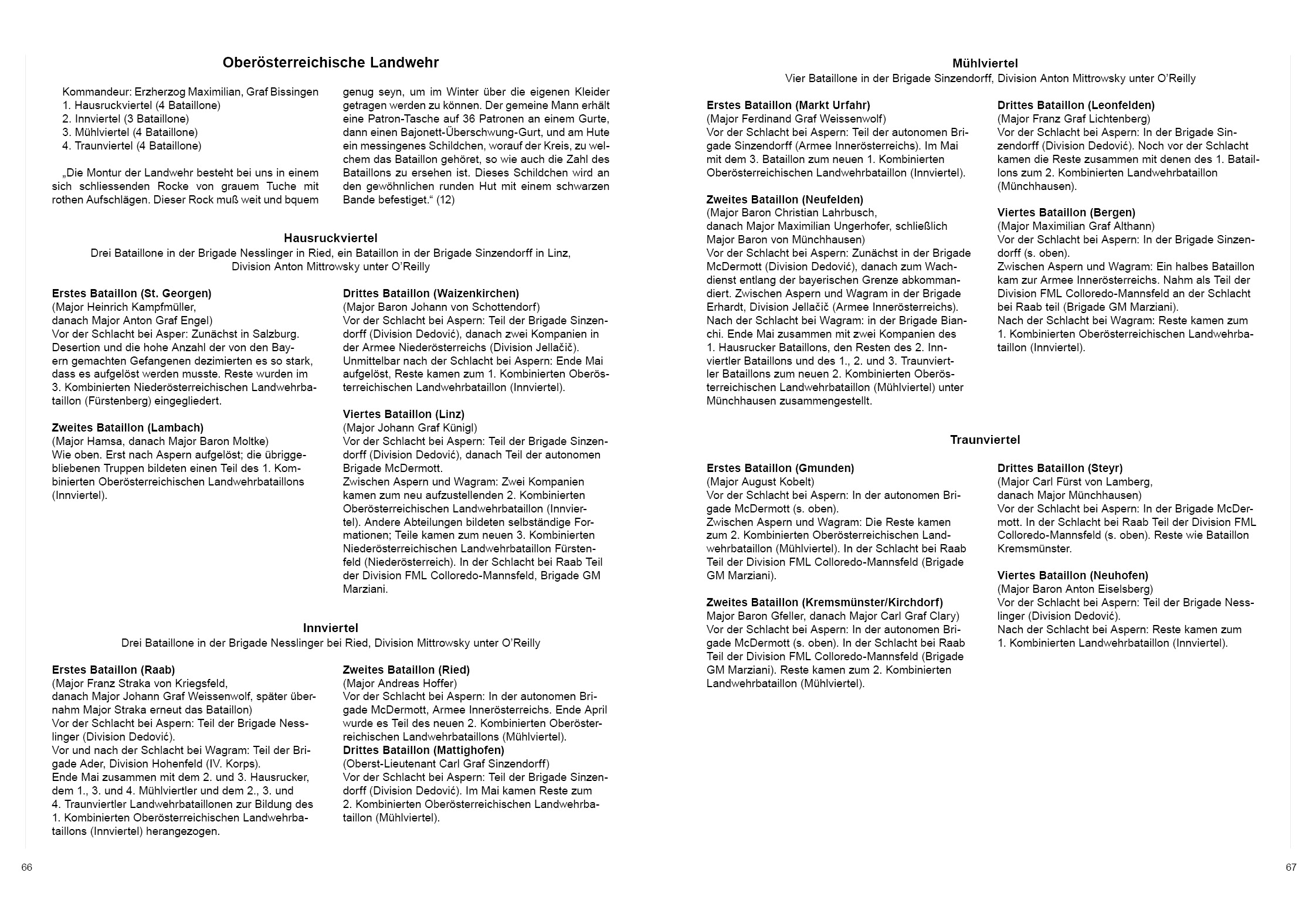 Im zweiten Teil des dreibändigen Werkes von Enrico Acerbi über die österreichische Armee von 1805 bis 1809 beschäftigt er sich mit seltenen untersuchten Truppen. Neben den Feldjägerbataillonen, die als Linientruppen noch bekannter sein dürften, behandelt dieser Band die Einheiten der Militärgrenze sowie der Landwehr.Gerade die Grenzregimenter unterstreichen durch ihre Rekrutierung in den Grenzregionen des Habsburger Reiches die Vielfalt der darin lebenden Völker. Nach einer geschichtlichen Einleitung zur Militärgrenze und deren Schutz vor allem gegen das Osmanische Reich, geht der Autor auf die einzelnen Grenzer-Einheiten ein und gibt insbesondere für den Feldzug von 1809 ein Zeugnis ihres Einsatzes ab.Noch bedeutender in der österreichischen Heeresorganisation ist aber die Landwehr zu werten. Die auf Betreiben Erzherzog Karls formierte Landwehr, sollte dem aktiven Heer ein Reservoir an einsatzfähigen Soldaten liefern und zusammen mit den österreichischen Linientruppen in der nächsten militärischen Auseinandersetzung zum Einsatz kommen. Acerbi beschreibt für die einzelnen Landesteile des Habsburgischen Reiches die Besonderheiten der dort formierten Landwehr und gibt eindrucksvolle Einblicke ihres Einsatzes im Krieg von 1809 gegen die Armeen Napoleons.Um den formationsgeschichtlichen Beschreibungen Acerbis einen optischen Eindruck über die abgehandelten Truppenteile beizugeben, wurden der deutschen Übersetzung zahlreiche, meist zeitgenössische Darstellungen beigefügt. So zeigen beispielsweise die hier erstmals in umfangreicher Form präsentierten Tafeln von Eder die Vielfalt der Uniformierung innerhalb der österreichischen Armee. Der deutlich erweiterte Bildteil bietet damit dem deutschsprachigen Leserkreis einen Mehrwert gegenüber der englischen Originalausgabe.
