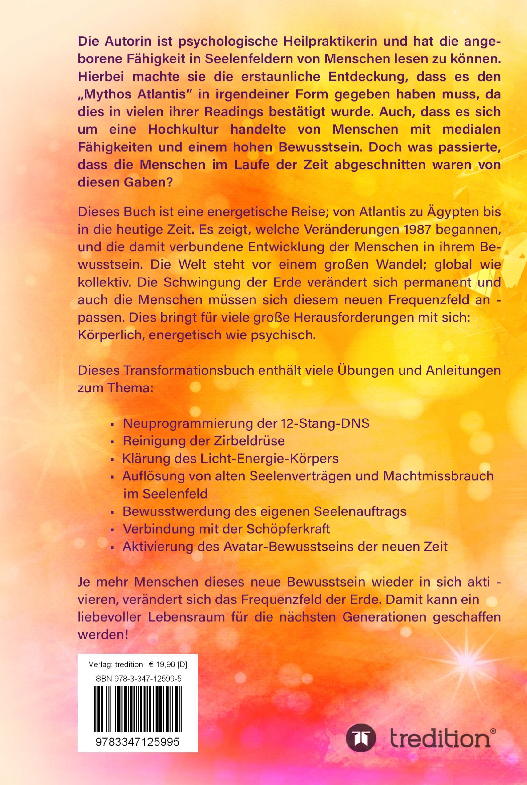 Hat es Atlantis wirklich gegeben? War es eine Hochkultur von Menschen mit medialen Fähigkeiten und einem hohen Bewusstsein? Was passierte, dass der Zugang zu diesem Wissen vermeintlich verloren ging?Dieses Buch ist eine energetische Reise; von Atlantis zu Ägypten bis in die heutige Zeit. Es zeigt, welche Veränderungen 1987 mit der Harmonischen Konvergenz begannen und die damit verbundene Entwicklung der Menschen in ihrem Bewusstsein. Die Welt steht vor einem großen Wandel, global wie kollektiv. Die Schwingung der Erde verändert sich permanent und auch die Menschen müssen sich diesem neuen Frequenzfeld anpassen. Dies bringt für die meisten viele Herausforderungen mit sich: Körperlich, energetisch wie psychisch.Dieses Transformationsbuch enthält viele Übungen und Anleitungen zum Thema:-Neuprogrammierung der 12 Stang DNS -Reinigung der Zirbeldrüse -Klärung des Licht-Energie-Körpers-Auflösung von alten Seelenverträgen und Machtmissbrauch im Seelenfeld-Bewusstwerdung des eigenen Seelenauftrags-Verbindung mit der eigenen Schöpferkraft-Aktivierung des Avatar-Bewusstseins der neuen ZeitJe mehr Menschen dieses neue Bewusstsein wieder in sich aktivieren, desto nachhaltiger verändert sich damit das morphogenetische Kollektiv. Somit kann auf diesem Planet in Liebe und Achtsamkeit ein Lebensraum für die nächsten Generationen geschaffen werden.