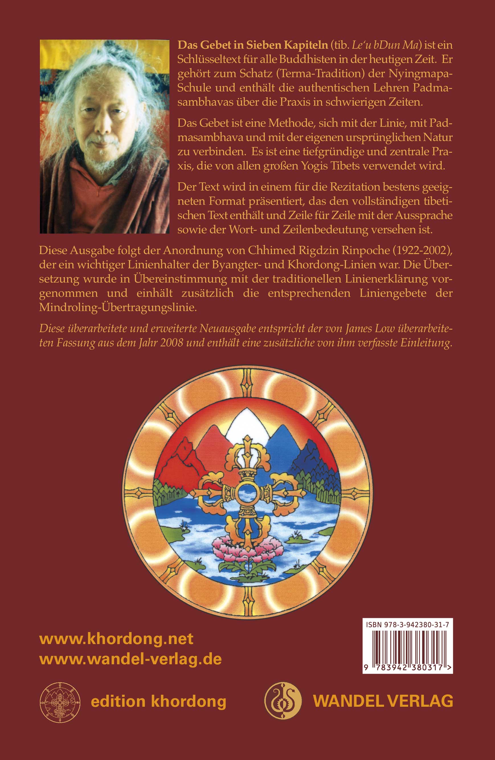 Das Buch mit Hardcover, fadengebungen, mit tibetischem Text, Aussprache, Wort-zu-Wort-, Zeilen- und Verse-Übersetzung und damit bestens für die Rezitationspraxis ausgestattet. Erstmals wurde der Text in englisch 1981 von The 'Chhi-Med Rig-'Dzin Society, Kalimpong & Rewalsar, Indien, veröffentlicht, übersetzt von Chhimed Rigdzin Lama und James Low. Diese Übersetzung wurde überarbeitet und erweitert und ins deutsche übertragen und komplett neu gesetzt.