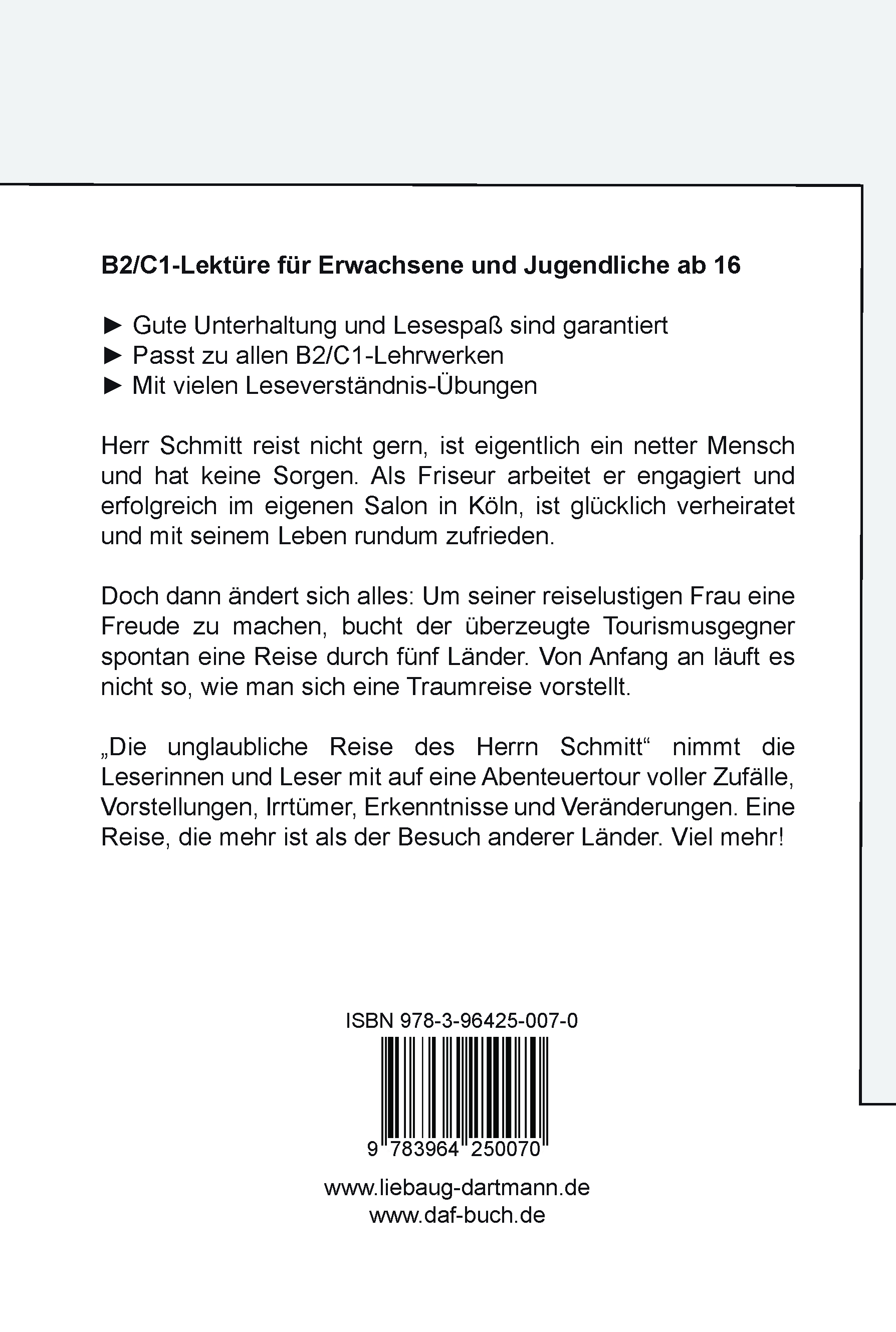Herr Schmitt reist nicht gern, ist eigentlich ein netter Mensch und hat keine Sorgen. Als Friseur arbeitet er engagiert und erfolgreich im eigenen Salon in Köln, ist glücklich verheiratet und mit seinem Leben rundum zufrieden. Doch dann ändert sich alles: Um seiner reiselustigen Frau eine Freude zu machen, bucht der überzeugte Tourismusgegner spontan eine Reise durch fünf Länder. Von Anfang an läuft es nicht so, wie man sich eine Traumreise vorstellt. "Die unglaubliche Reise des Herrn Schmitt" nimmt die Leserinnen und Leser mit auf eine Abenteuertour voller Zufälle, Vorstellungen, Irrtümer, Erkenntnisse und Veränderungen. Eine Reise, die mehr ist als der Besuch anderer Länder. Viel mehr!