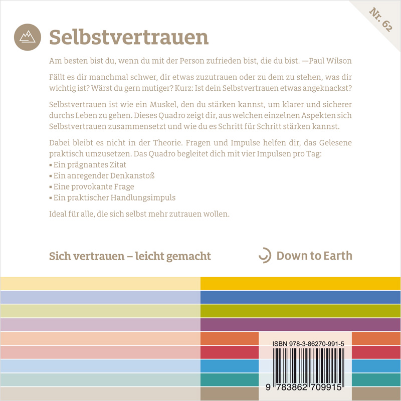 Am besten bist du, wenn du mit der Person zufrieden bist, die du bist - Paul WilsonFällt es dir manchmal schwer, dir etwas zuzutruaen oder zu dem zu stehen, was dir wichtig ist? Wärst du gern mutiger? Kurz: Ist dein Selbstvertrauen etwas angeknackst?Selbstvertrauen ist wie ein Muskel, den du stärken kannst, um klarer und sicherer durchs Leben zu gehen. Dieses Quadro zeigt dir, aus welchen einzelnen Aspekten sich Selbstvertrauen zusammensetzt und wie du es Schritt für Schritt stärken kannst.Dabei bleibt es nicht in der Theorie: Fragen und Impulse helfen dir, das Gelesene praktisch umzusetzen. Das Quadro begleitet dich, mit vier Impulsen pro Tag: Ein prägnantes Zitat, ein anregender Denkanstoß, eine provokante Frage, ein praktischer Handlungsimpuls.Ideal für alle, die sich selbst mehr zutrauen wollen. Sich vertrauen - leicht gemacht!