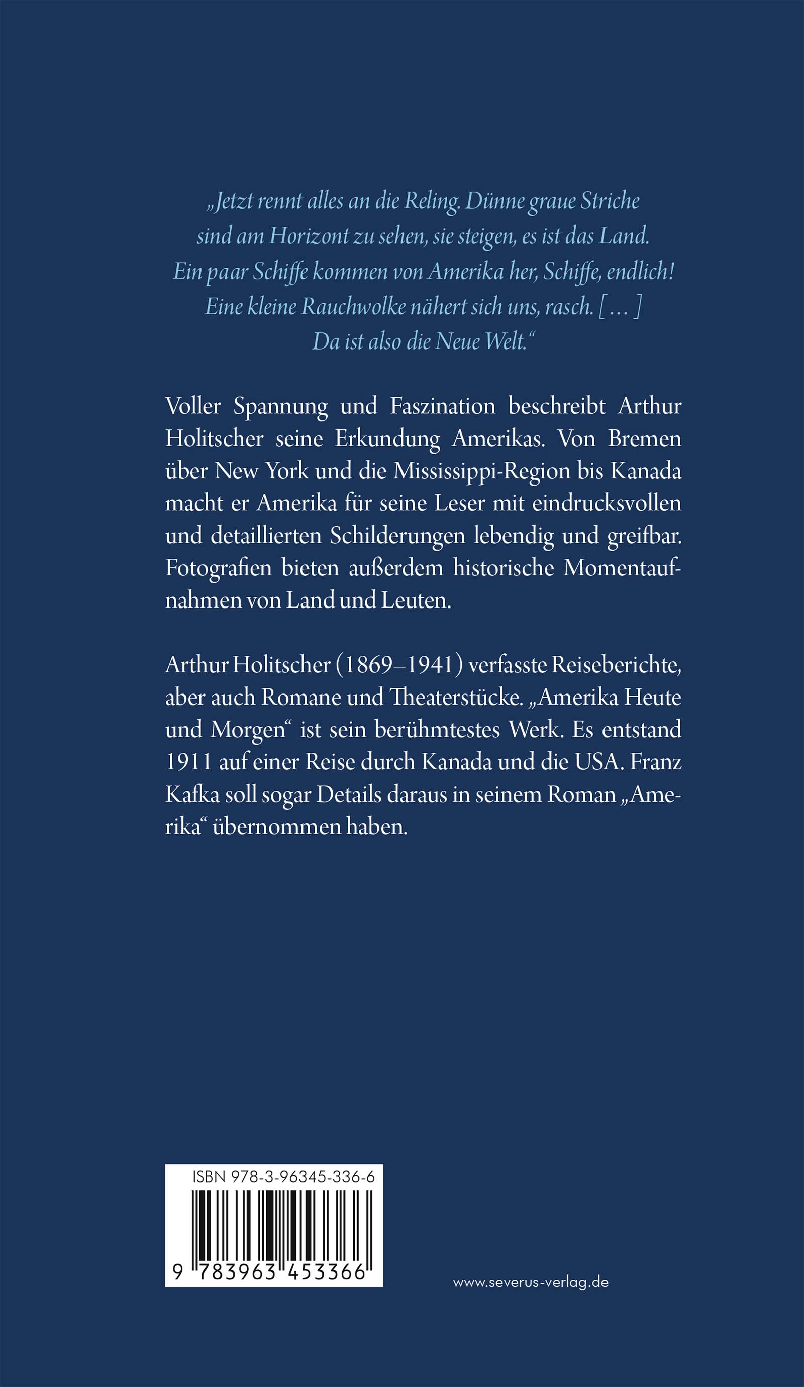 "Jetzt rennt alles an die Reling. Dünne graue Striche sind am Horizont zu sehen, sie steigen, es ist das Land. Ein paar Schiffe kommen von Amerika her, Schiffe, endlich! Eine kleine Rauchwolke nähert sich uns, rasch. [...] Da ist also die Neue Welt." Voller Spannung und Faszination beschreibt Arthur Holitscher seine Erkundung Amerikas. Von Bremen über New York und die Mississippi-Region bis Kanada macht er Amerika für seine Leser mit eindrucksvollen und detaillierten Schilderungen lebendig und greifbar. Fotografien bieten außerdem historische Momentaufnahmen von Land und Leuten. Arthur Holitscher (1869-1941) verfasste Reiseberichte, aber auch Romane und Theaterstücke. "Amerika Heute und Morgen" ist sein berühmtestes Werk. Es entstand 1911 auf einer Reise durch Kanada und die USA. Franz Kafka soll sogar Details daraus in seinem Roman "Amerika" übernommen haben.