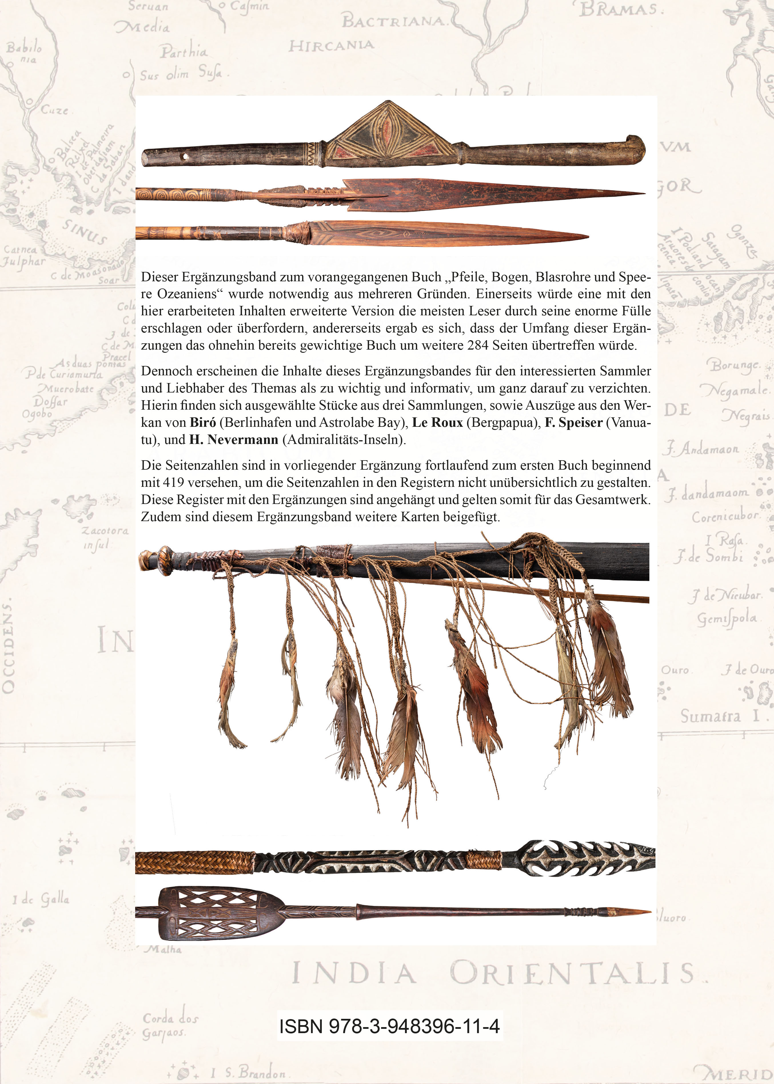 Dieser Ergänzungsband zum vorangegangenen Buch „Pfeile, Bogen, Blasrohre und Speere Ozeaniens“ wurde notwendig aus mehreren Gründen. Einerseits würde eine mit den hier erarbeiteten Inhalten erweiterte Version die meisten Leser durch seine enorme Fülle erschlagen oder überfordern, andererseits ergab es sich, dass der Um- fang dieser Ergänzung zum Buch einen Umfang angenommen hat, der 600 Seiten überschreitet. Eine einbändige erweiterte Neuausgabe würde das ohnehin bereits gewichtige Buch zu schwer und dick machen.