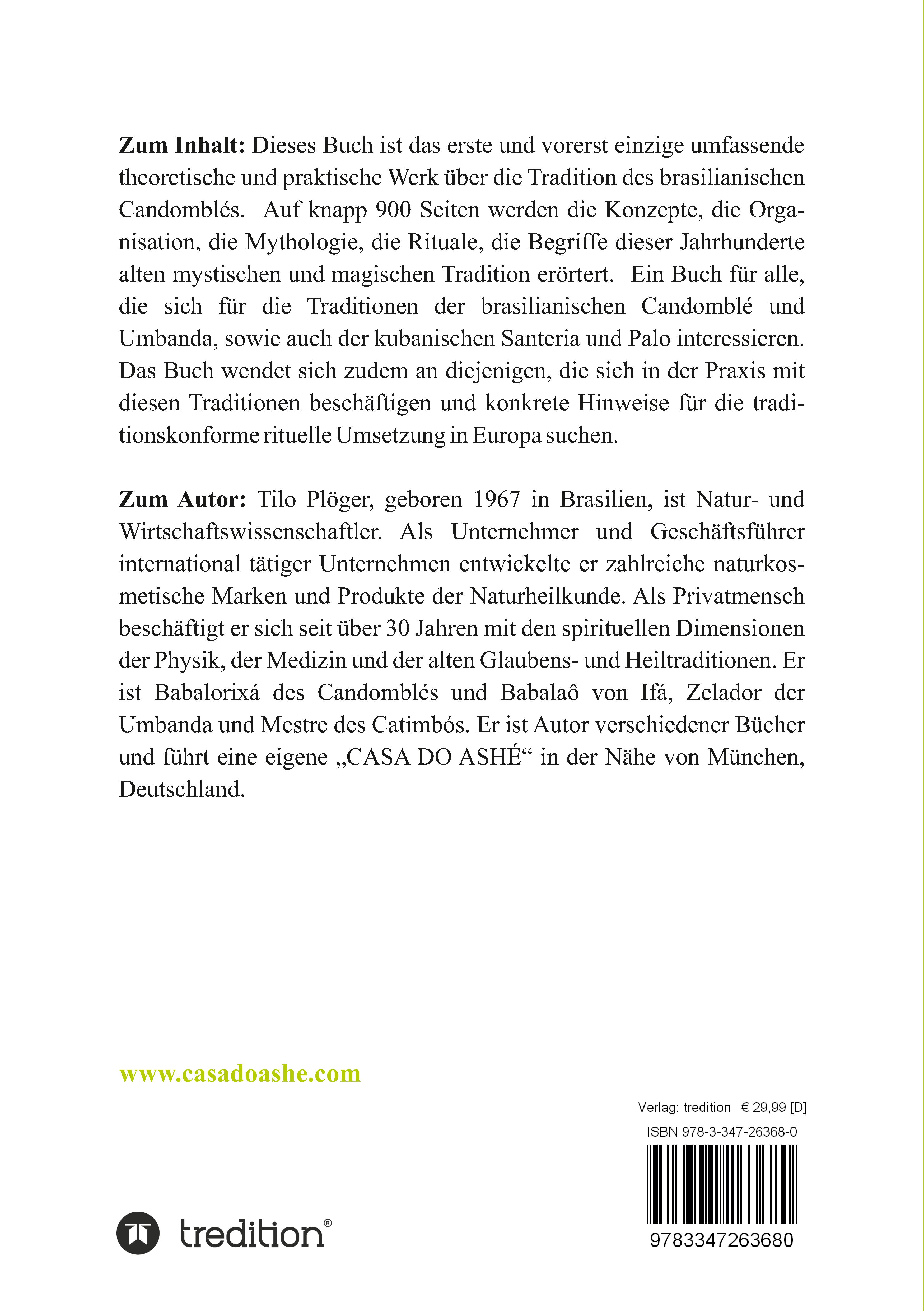 Dieses Buch ist das erste und vorerst einzige umfassende theoretische und praktische Werk über die Tradition des brasilianischen Candomblés. Auf knapp 900 Seiten werden die Konzepte, die Organisation, die Mythologie, die Rituale, die Begriffe dieser Jahrhunderte alten mystischen und magischen Tradition erörtert. Ein Buch für alle, die sich für die Traditionen der brasilianischen Candomblé und Umbanda, sowie auch der kubanischen Santeria und Palo interessieren. Das Buch wendet sich zudem an diejenigen, die sich in der Praxis mit diesen Traditionen beschäftigen und konkrete Hinweise für die traditionskonforme rituelle Umsetzung in Europa suchen.