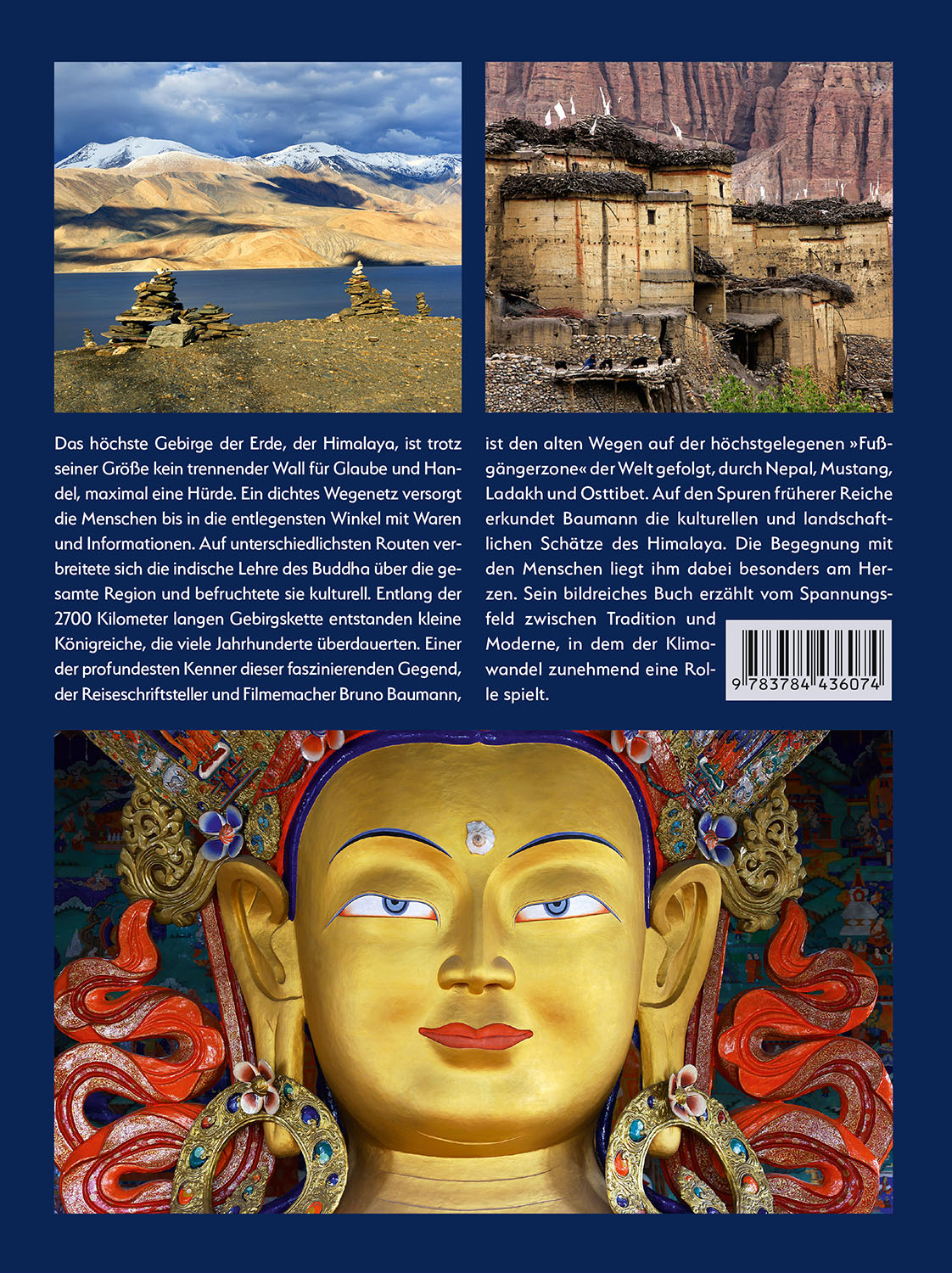 "Hundert göttliche Zeitalter reichen nicht aus, um alle Wunder und Herrlichkeit des Himachal zu beschreiben", heißt es in einer alten indischen Schrift. Bruno Baumann vereint in seinem Bild-Textband alle historischen Himalaya-Königreiche, die entlang der 2700 km langen Gebirgskette je bestanden haben: Bhutan, Ladakh, Sikkim, Zanskar, Mustang und Guge. Manche von ihnen überdauerten viele Jahrhunderte und konnten ihre Unabhängigkeit bis ins letzte Jahrhundert behaupten, ein einziges - Bhutan - sogar bis zum heutigen Tag. Sie alle haben eines gemeinsam: Sie sind Erben des indischen Buddhismus, der sich auf vielfältigen Wegen über die gesamte Himalaya-Region verbreitete und sie kulturell befruchtete. Baumann ist den alten Wegen auf der höchst gelegenen Fußgängerzone der Welt gefolgt: entlang der alten Salzstraße nach Mustang, auf dem Weg der Sherpa über den Nangpa La von Tibet nach Nepal, durch den "Grand Canyon" des Himalaya nach Guge. Er besuchte Klöster und Feste in Ladakh und erkundete Bhutan, wo der Lebensstandard am Bruttosozialglück gemessen wird. Ein im wahrsten Sinne des Wortes wundervoller Einblick in eine faszinierende Region.