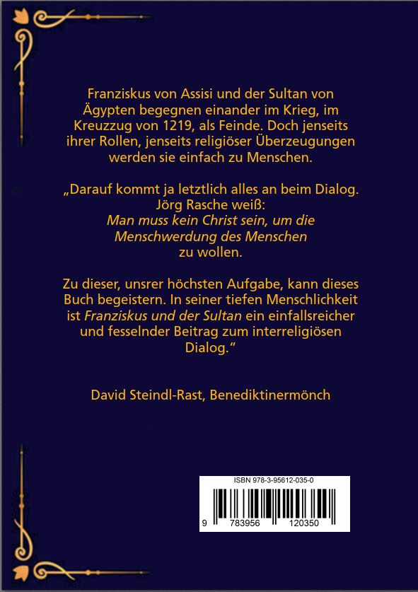 Auf Grund dieser Einsicht, rekonstruiert Jörg Rasche ein 1219 historisch belegtes, einzigartig spannendes Ereignis aus der gemeinsamen Geschichte von Muslimen und Christen: Franz von Assisi und der Sultan al-Kamil begegnen einander „Mensch zu Mensch“ in einem mutigen Gespräch. Jenseits ihrer Rollen, jenseits religiöser Überzeugungen, werden sie einfach zu Menschen.