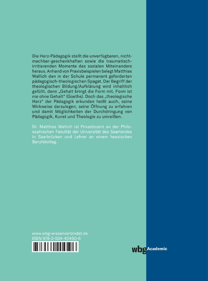 In der Bildungsdebatte dürfen Fragen der pädagogisch-theologischen Orientierung nicht übersehen werden. Offenheit für das Gegenüber sowie das Verstehen der Tiefendimension der Kommunikation können als Fundament aller Bildung gelten. Zum einen sind die theologischen Implikationen des sozialen Miteinanders, Momente des Unbedingten, Letztgültigen in der Begegnung, aufzuweisen und eine relationale Theologie vorzustellen. Zum anderen legt die Ausrichtung an den Konstituenten der Mitmenschlichkeit eine herzliche Pädagogik nahe. Sie initiiert eine Kultur der Anerkennung und des Wohlwollens. Wie wichtig Klima-Fragen sind, wird deutlich: Als "Agenten für das nichtobjektivierbare Zwischen" fühlen sich Lehrkräfte für die Atmosphäre in der Schule verantwortlich. Herzliche Pädagogik versteht die eigene Praxis als Kunst.Die Brisanz dieses Ansatzes zeigt Mathhias Wallich anhand von Fallbeispielen aus der Schulwirklichkeit auf und füllt dabei den Begriff der theologischen Bildung inhaltlich.