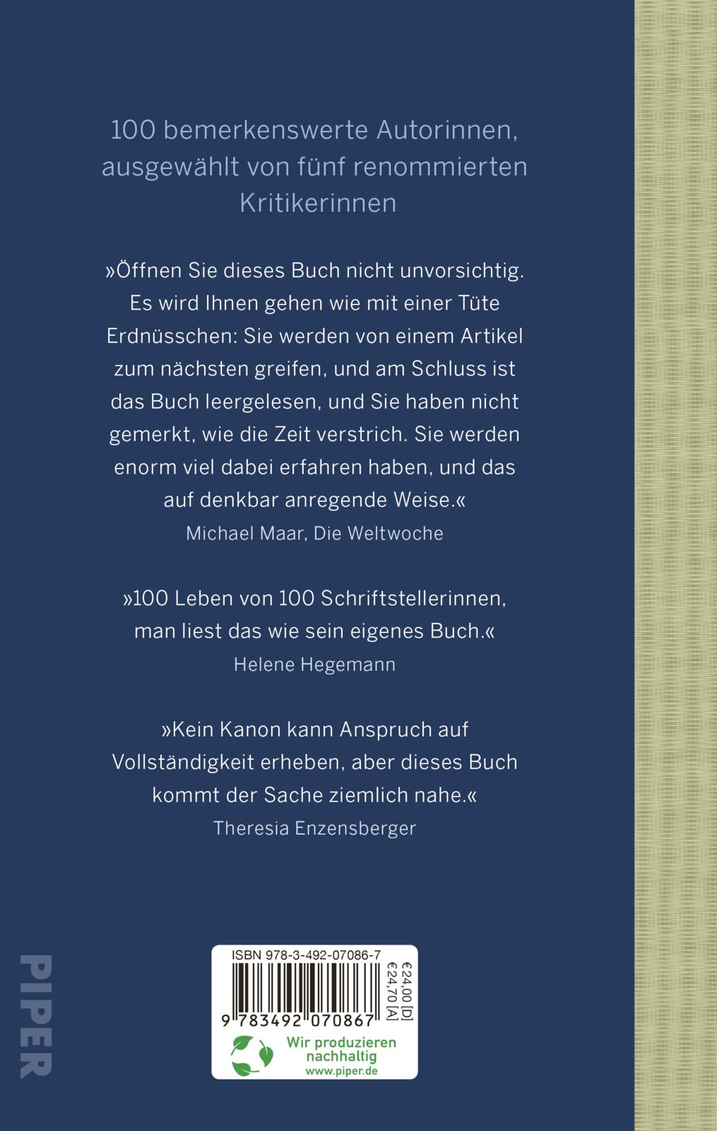 »Die Portraits sprühen vor originellen Gedanken und Überlegungen zu den Literatinnen, sind also in vielerlei Hinsicht anregend – und zwar nicht zuletzt zum Kauf der Werke mancher der vorgestellten Autorinnen. Denn in dem Band ist manche Entdeckung zu machen. Wenn er einen Wunsch offen lässt, dann den nach einem Folgeband, in dem 100 vergessene oder unterschätzte Autorinnen vorgestellt werden.«