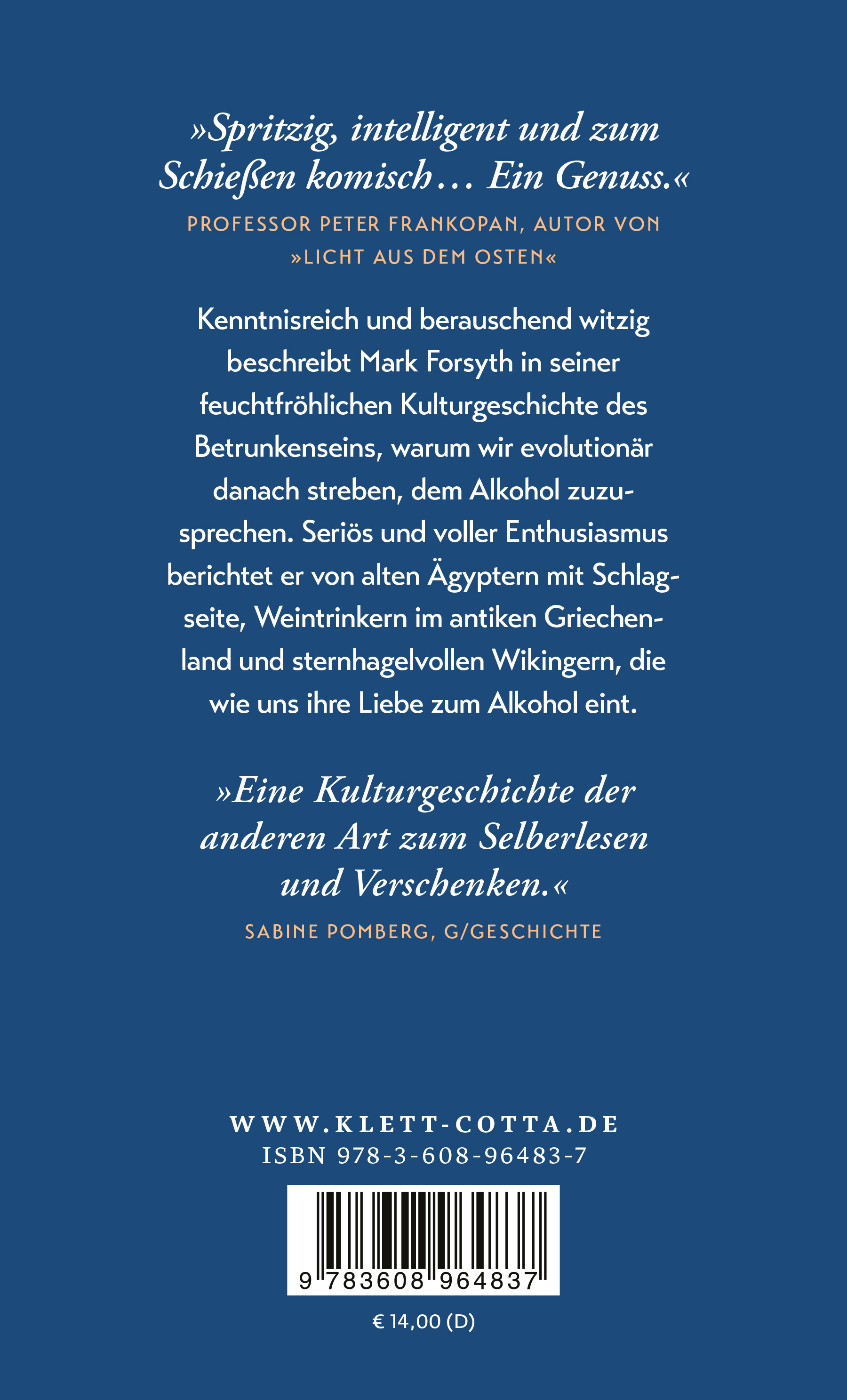 Kenntnisreich und berauschend witzig beschreibt Mark Forsyth in seiner feuchtfröhlichen Kulturgeschichte des Betrunkenseins, warum wir evolutionär danach streben, dem Alkohol zuzusprechen. Seriös und voller Enthusiasmus berichtet er von alten Ägyptern mit Schlagseite, Weintrinkern im antiken Griechenland und sternhagelvollen Wikingern, die wie uns ihre Liebe zum Alkohol einte.