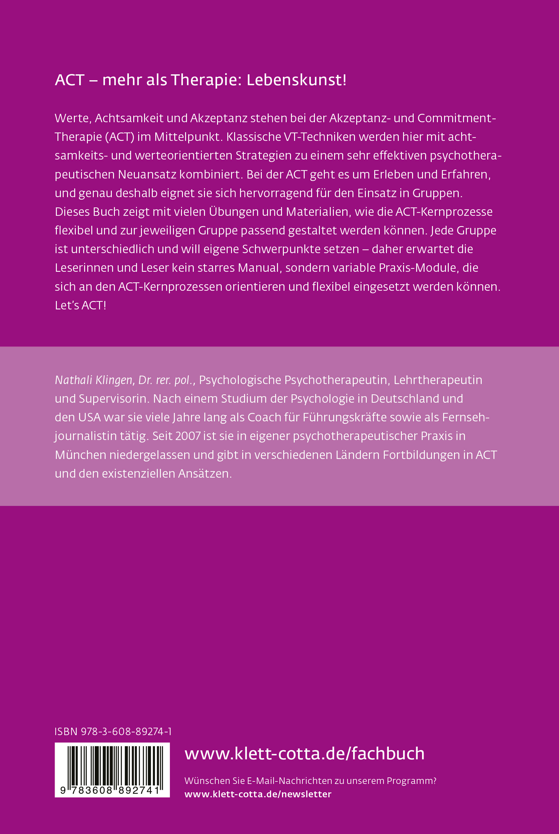 | Schlagworte | Achtsamkeit • ACT-Ansatz • Akzeptanz- und Commitmenttherapie • Choice Point Model • defusion • Dritte Welle der Verhaltenstherapie • Gruppe • Gruppentherapie • Gruppentools • Kernprozesse • Matrix • Praxisbuch • Übungen • Verhaltenstherapie • Werte • Werteorientiertes handeln |