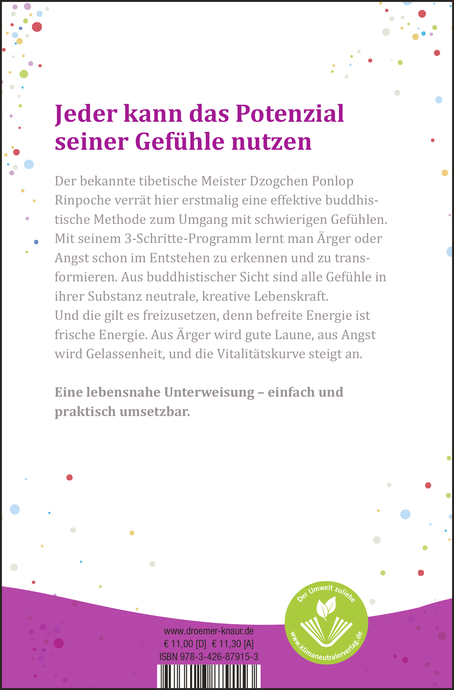 lt;p>Der bekannte tibetische Meister Dzogchen Ponlop Rinpoche verrät hier erstmalig eine effektive buddhistische Methode zum Umgang mit schwierigen Gefühlen. Mit seinem 3-Schritte-Programm lernt man Ärger oder Angst schon im Entstehen zu erkennen und zu transformieren. Aus buddhistischer Sicht sind alle Gefühle in ihrer Substanz neutrale, kreative Lebenskraft. Und die gilt es freizusetzen, denn befreite Energie ist frische Energie. Aus Ärger wird gute Laune, aus Angst wird Gelassenheit, und die Vitalitätskurve steigt an. Der Lebensratgeber bietet eine Menge Übungen - teils reflektierender, teils meditativer Art.