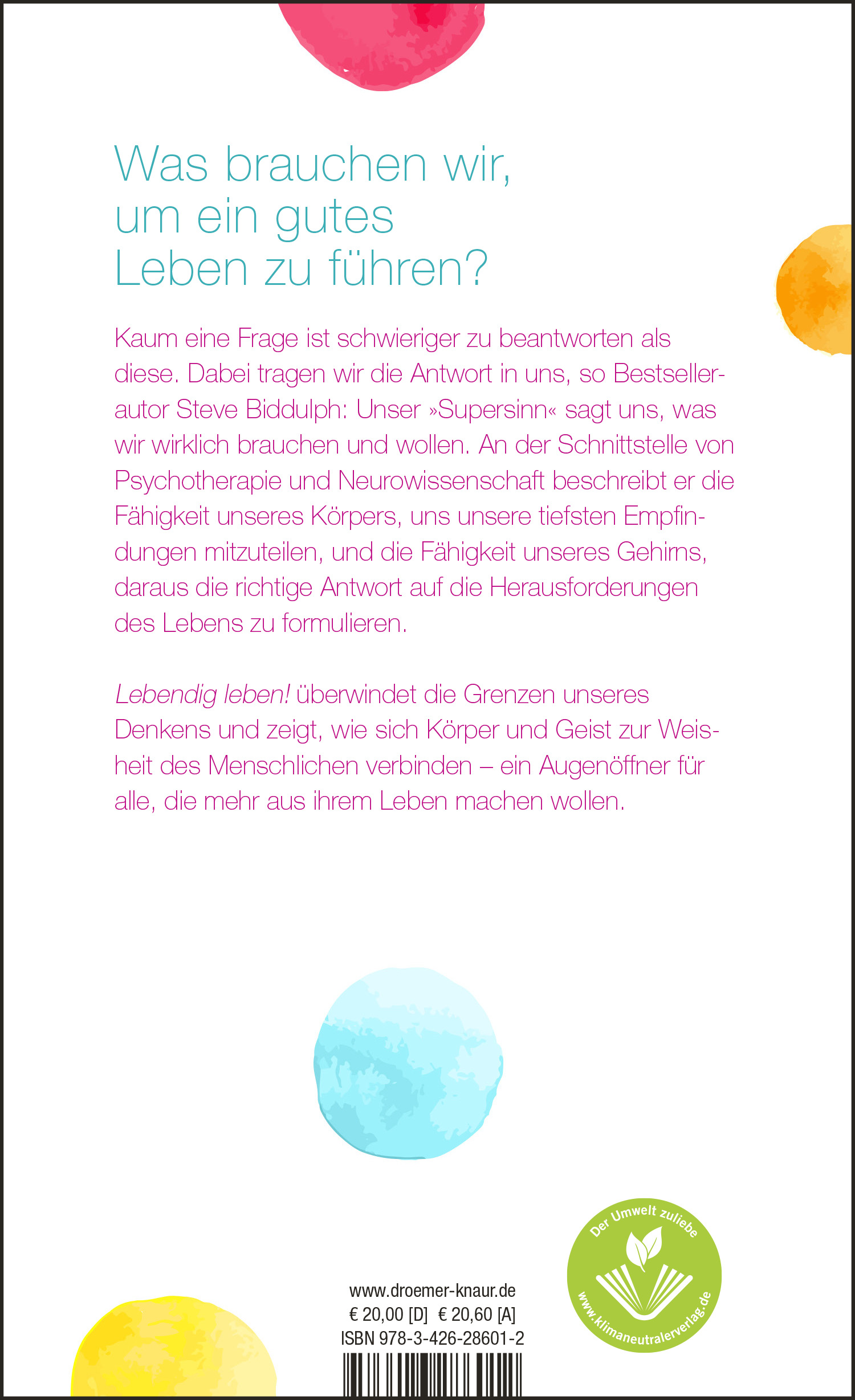 Doch das ist kein Grund, den Kopf in den Sand zu stecken: Steve Biddulph kennt das Mittel, um das Zusammenspiel von Körper, Geist und Seele für solch ein schöpferisches, lebendiges Leben zu nutzen. Denn lebendig leben, so der Bestsellerautor, ist die Wiederentdeckung der Weisheit und Klugheit unseres Körpers, dessen Informationen uns helfen, ganz und gar Mensch zu sein, das heißt, uns selbst und der Welt mit Empathie zu begegnen und die eigenen Fähigkeiten und Talente für unser Glück und das Glück möglichst vieler anderer Menschen einzusetzen. Unter der Anleitung des weltweit renommierten Familien-Psychologen lernen wir Schritt für Schritt lebendig zu leben!
