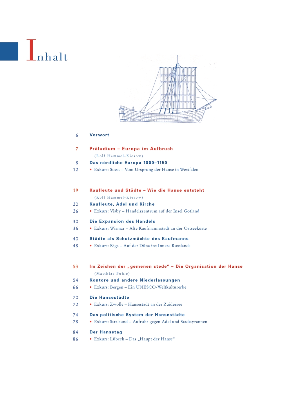 VorwortPräludium - Europa im Aufbruch( R o l f H a m m e l - K i e s o w )Das nördliche Europa 1000-1150- Exkurs: Soest - Vom Ursprung der Hanse in WestfalenKaufleute und Städte - Wie die Hanse entsteht( R o l f H a m m e l - K i e s o w )Kaufleute, Adel und Kirche- Exkurs: Visby - Handelszentrum auf der Insel GotlandDie Expansion des Handels- Exkurs: Wismar - Alte Kaufmannsstadt an der OstseeküsteStädte als Schutzmächte des Kaufmanns- Exkurs: Riga - Auf der Düna ins Innere RusslandsIm Zeichen der "gemenen stede" - Die Organisation der Hanse( M a t t h i a s P u h l e )Kontore und andere Niederlassungen- Exkurs: Bergen - Ein UNESCO-WeltkulturerbeDie Hansestädte- Exkurs: Zwolle - Hansestadt an der ZuiderseeDas politische System der Hansestädte- Exkurs: Stralsund - Aufruhr gegen Adel und StadttyrannenDer Hansetag- Exkurs: Lübeck - Das "Haupt der Hanse"Ein starkes Netzwerk - Der hansische HandelDer hansische Kaufmann ( R o l f H a m m e l - K i e s o w )- Exkurs: Köln - Metropole des EnglandhandelsDas hansische Handelssystem ( R o l f H a m m e l - K i e s o w )- Exkurs: Thorn - Umschlagplatz der Hanse nach SüdosteuropaSeeschiffe und Seeschifffahrt ( R o l f H a m m e l - K i e s o w )- Exkurs: Lüneburg - Dank Salz zur StadtfreiheitVom Kontor zum Endverbraucher ( R o l f H a m m e l - K i e s o w )- Exkurs: Bremen - Lange am Rande der HanseDie Vitalienbrüder ( M a t t h i a s P u h l e )- Exkurs: Hamburg - Die Hanse im AutokennzeichenDie "dudesche hense" - Im europäischen KonzertPolitik und Diplomatie ( M a t t h i a s P u h l e )- Exkurs: Braunschweig - Unter welfischer HerrschaftPartner und Konkurrenten der Hanse ( M a t t h i a s P u h l e )- Exkurs: Danzig - Engländer unerwünscht, Holländer erwünschtDie Auflösung der Hanse ( R o l f H a m m e l - K i e s o w )- Exkurs: Münster - Stadt des Westfälischen FriedensWas bleibt - Das Erbe der Hanse( M a t t h i a s P u h l e )Bleibende Einflüsse- Exkurs: Reval - Die Altstadt als UNESCO-WeltkulturerbeAnhangAnmerkungenQuellen und LiteraturOrtsregisterNamenregisterBildnachweis
